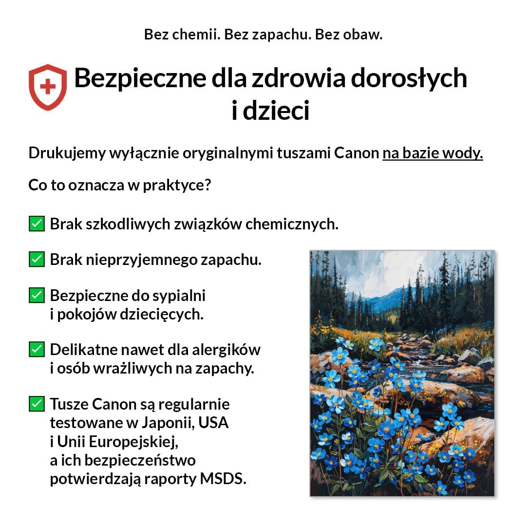 Tak, absolutnie! Drukujemy wyłącznie certyfikowanymi, bezwonnymi tuszami pigmentowymi Canon Lucia Pro na bazie wody. Są one w pełni bezpieczne dla zdrowia, nie zawierają rozpuszczalników i mogą być bez obaw stosowane w sypialniach i pokojach dziecięcych.