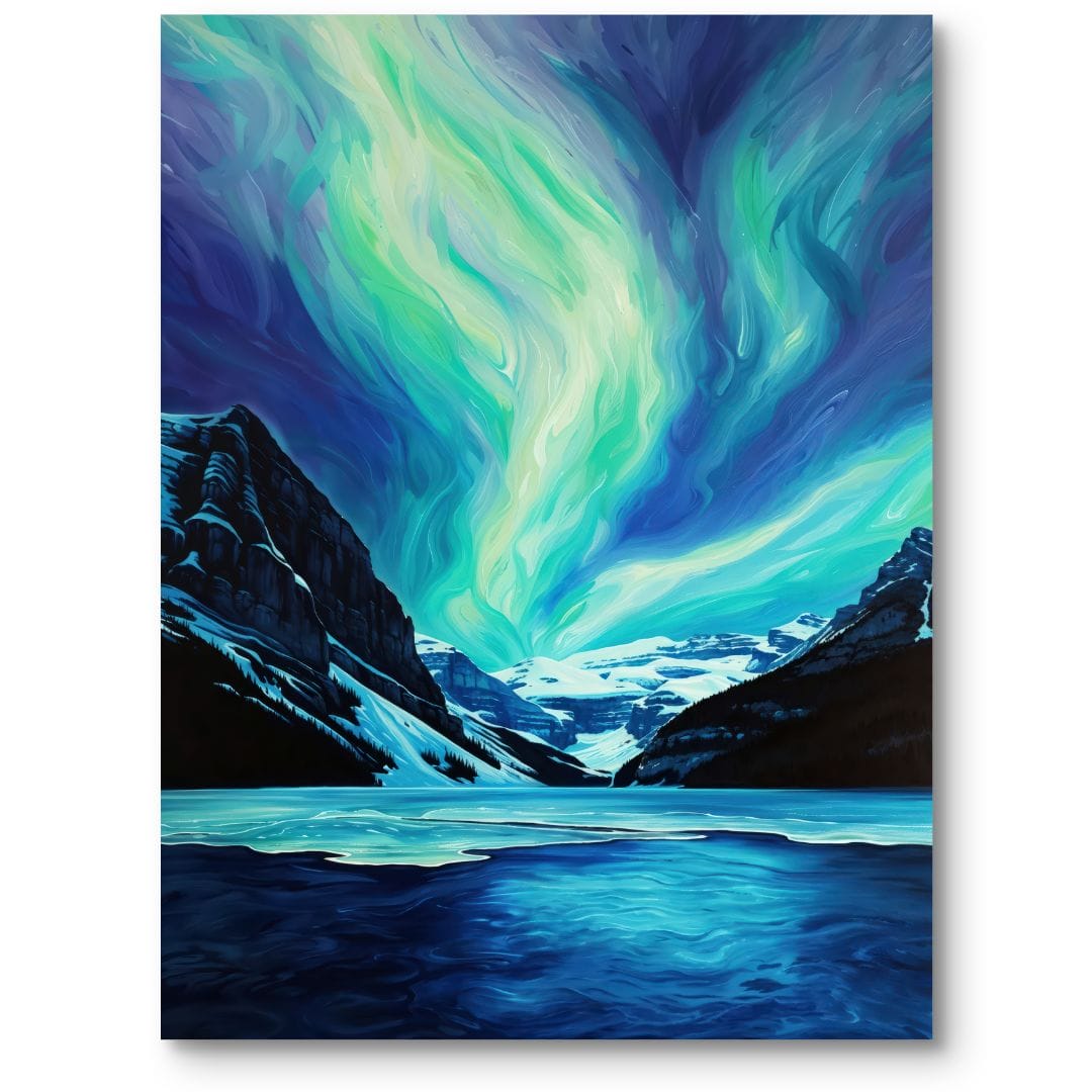 Obraz na płótnie ukazuje zachwycający pejzaż górski, nad którym rozpościera się spektakularna zorza polarna. Śnieżyste szczyty i zamarznięte jezioro tworzą majestatyczne tło dla hipnotyzujących tańczących świateł o intensywnych, zielono-niebieskich barwach. Ten fascynujący motyw przenosi widza w sam środek jednego z najbardziej niezwykłych zjawisk natury, podkreślając ulotną magię i niepowtarzalną atmosferę dalekiej północy.