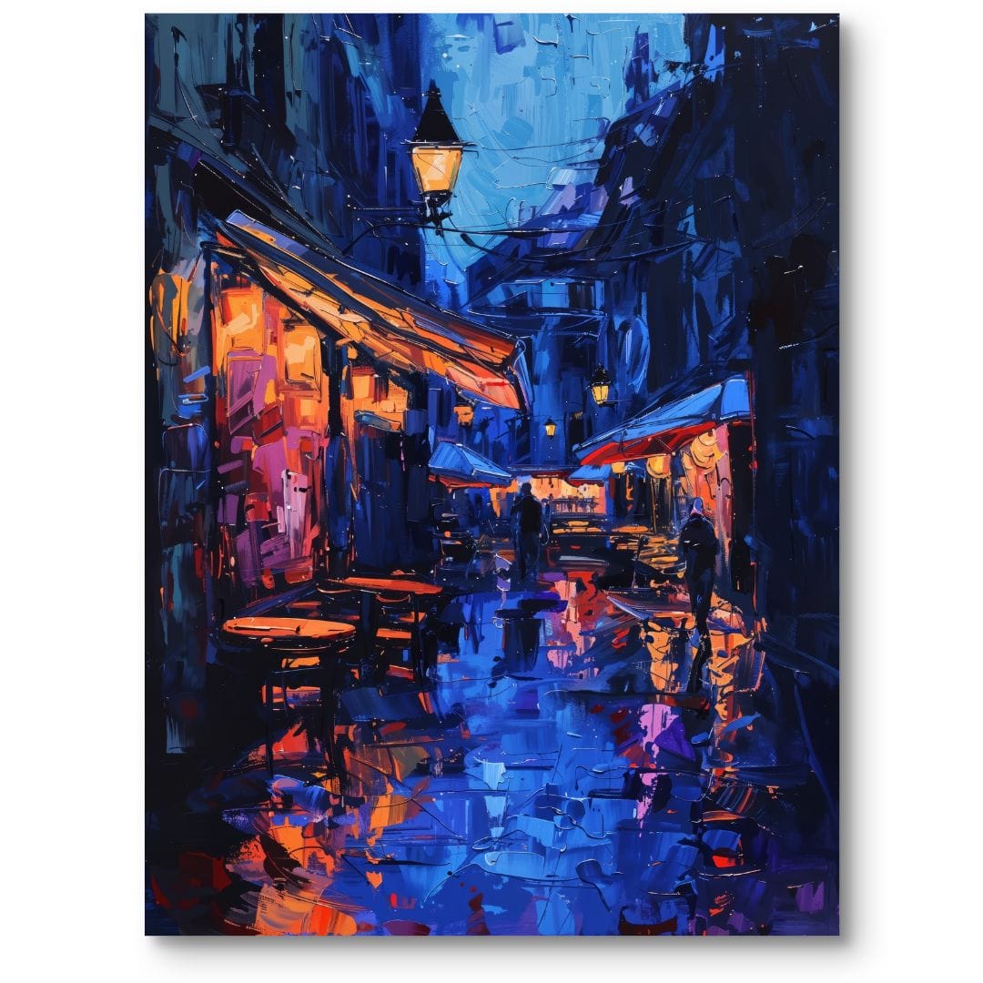 Obraz na płótnie odsłania przed widzem urzekającą, nocną scenę miejską inspirowaną impresjonizmem. Uliczka rozświetlona ciepłym blaskiem latarni odbija ich światło na mokrych chodnikach, tworząc feerię kolorowych refleksów. Ten niezwykle klimatyczny obraz na ścianę przenosi do świata spokojnych wieczorów, gdzie pierwszoplanową rolę odgrywa gra światła i cienia.