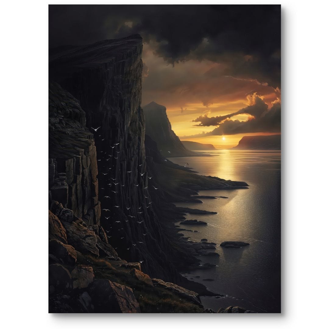 Dzieło emanuje aurą refleksji i zadumy. Kontrastowe tonacje oraz gra świateł nadają mu melancholijny charakter i skłaniają do kontemplacji. Zachód słońca w połączeniu z wyniosłymi klifami symbolizuje trwałość natury oraz cykliczność przemijania. To obraz, który doskonale oddaje głębokie i nieoczywiste emocje.