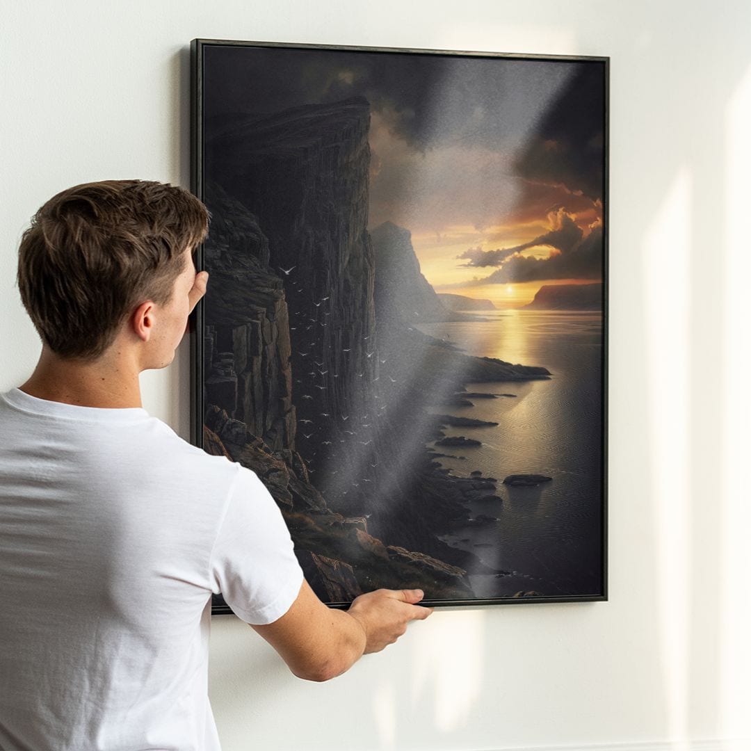 Obraz na płótnie ukazuje monumentalny krajobraz górski o zachodzie słońca. Na pierwszym planie dominują potężne klify, które górują nad spokojnym, rozległym akwenem. W tle złote promienie słońca rozświetlają chmury, tworząc spektakularną panoramę nieba. Sceneria emanuje niezwykłym dramatyzmem dzięki kontrastowi pomiędzy głębokimi cieniami skał a jasnością, jaką nadaje światło zachodzącego dnia.