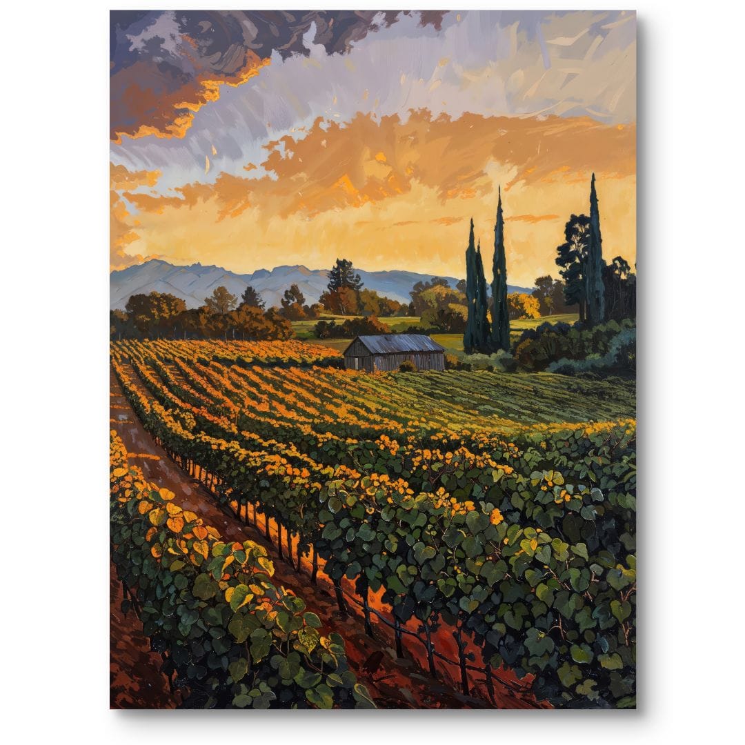 Obraz na płótnie przedstawia urokliwy krajobraz winnicy skąpanej w ciepłym świetle zachodzącego słońca. Winorośl rozpościera się szeroko na pierwszym planie, prowadząc wzrok ku imponującym górom majaczącym w oddali. Cała scena emanuje nastrojem pełnym harmonii, a promienie zachodzącego słońca otulają pejzaż złotą poświatą, podkreślając jego naturalne piękno.