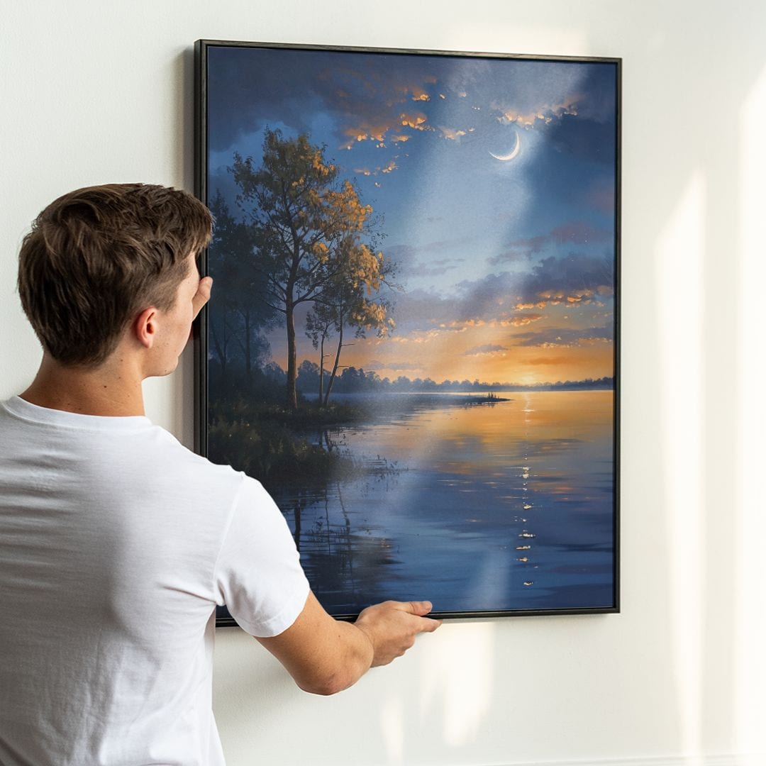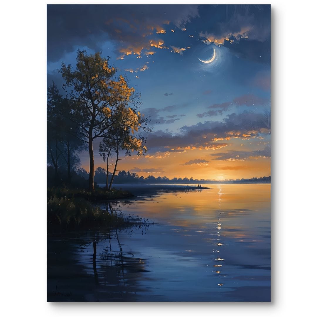 Ten obraz na płótnie emanuje spokojem i wyciszeniem, doskonale sprzyjając refleksji i odpoczynkowi. Obecność księżyca w nowiu symbolizuje nowe etapy i odrodzenie, zaś spokojna woda oraz drzewa podkreślają poczucie bezpieczeństwa i naturalnej harmonii. Zachód słońca dodaje motyw ukojenia i przejścia w nowy czas.