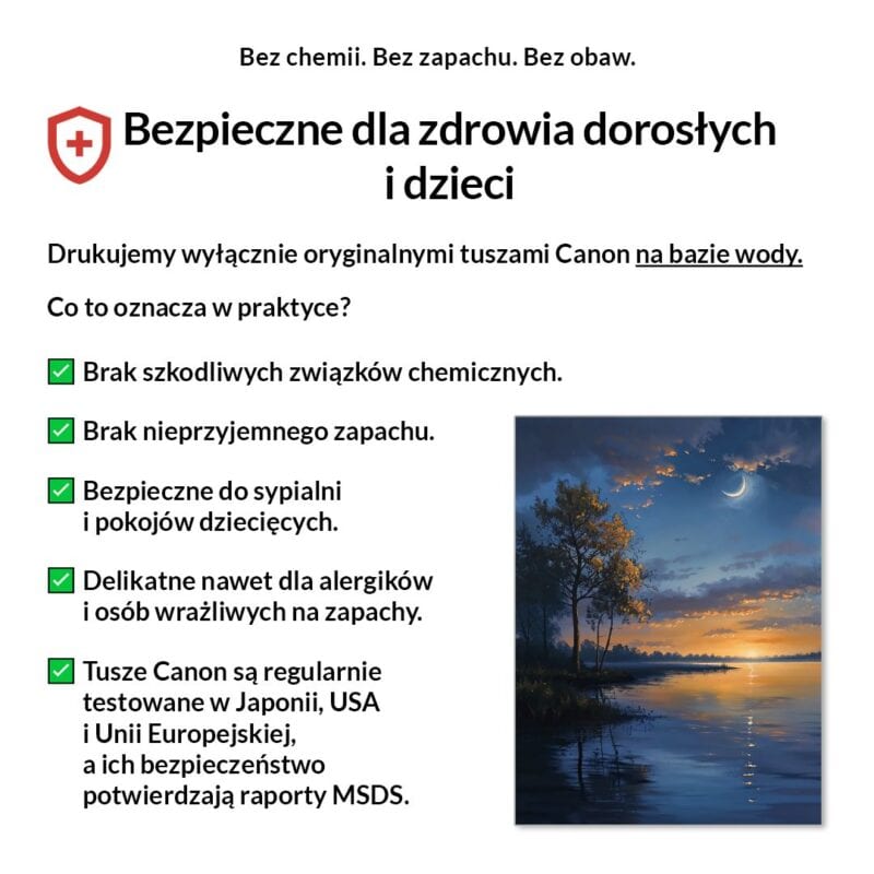 Tak, absolutnie! Drukujemy wyłącznie certyfikowanymi, bezwonnymi tuszami pigmentowymi Canon Lucia Pro na bazie wody. Są one w pełni bezpieczne dla zdrowia, nie zawierają rozpuszczalników i mogą być bez obaw stosowane w sypialniach i pokojach dziecięcych.