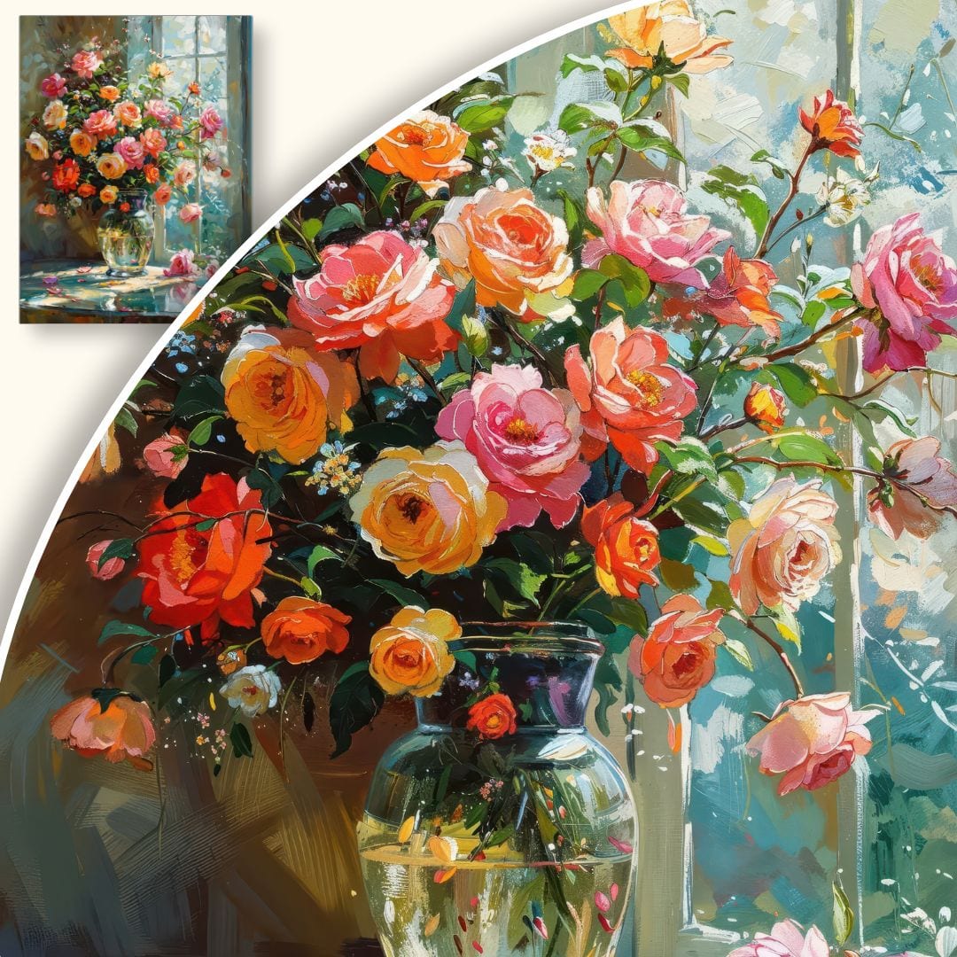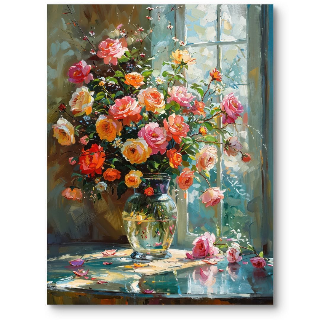 Ten wyjątkowy obraz na płótnie ukazuje wazon pełen barwnych róż, ustawiony na stole przy jasnym oknie. Scena tętni życiem i kolorem, wprowadzając do wnętrza nutę optymizmu oraz oddech natury. Precyzyjnie oddane detale kwiatów oraz migoczące światło przenikające przez szybę tworzą harmonijną całość, która zachwyca zmysły swoją subtelnością i głębią.