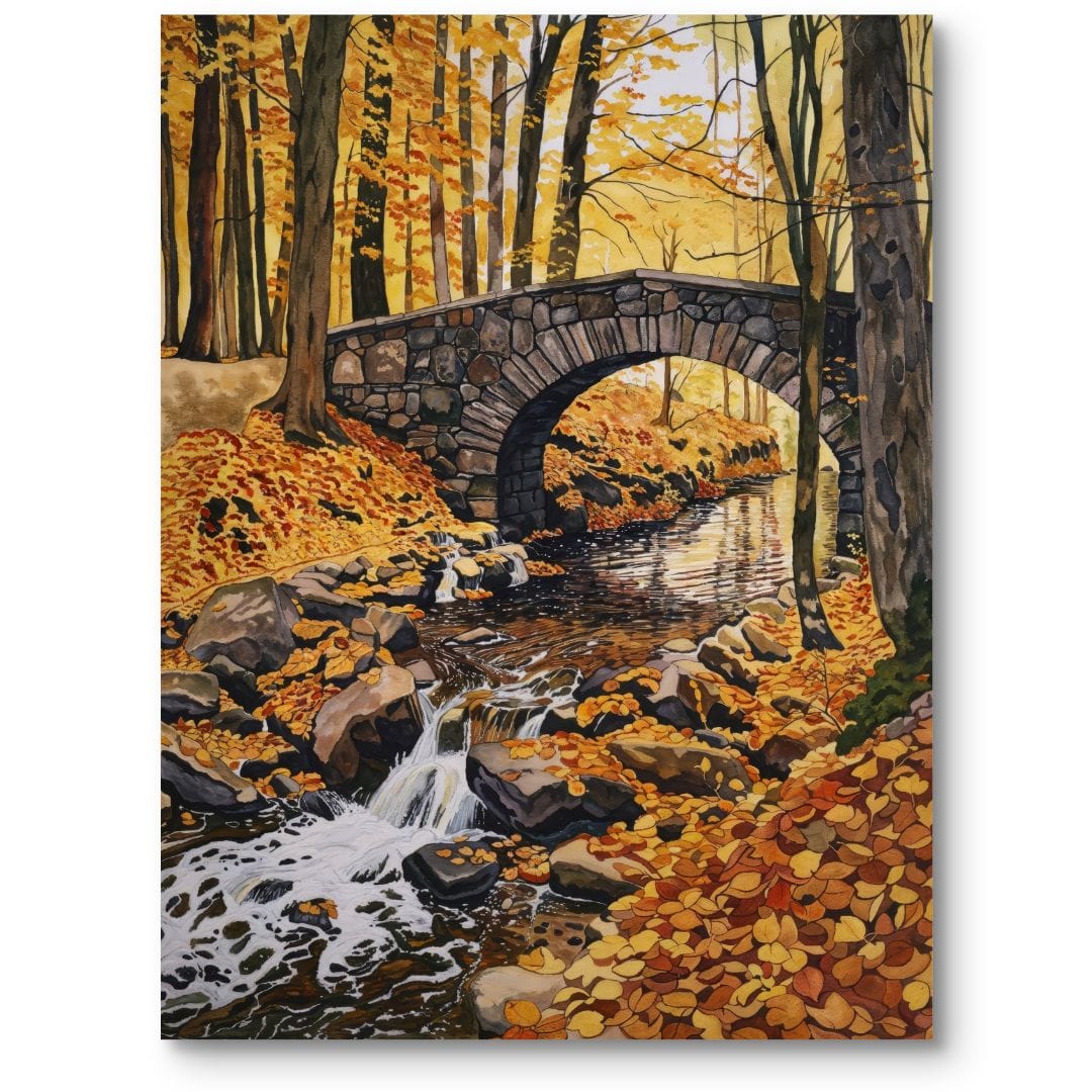 Obraz na płótnie ukazuje malowniczy jesienny krajobraz z urokliwym, kamiennym mostem rozpiętym nad leniwie płynącą rzeką. Kompozycja tchnie ciepłem – złote, pomarańczowe i brązowe odcienie dominują, nasycając pejzaż przyjemną, przytulną atmosferą. Spadające z drzew liście pokrywają brzegi oraz odbijają się na tafli wody, dodając całości romantycznego uroku.