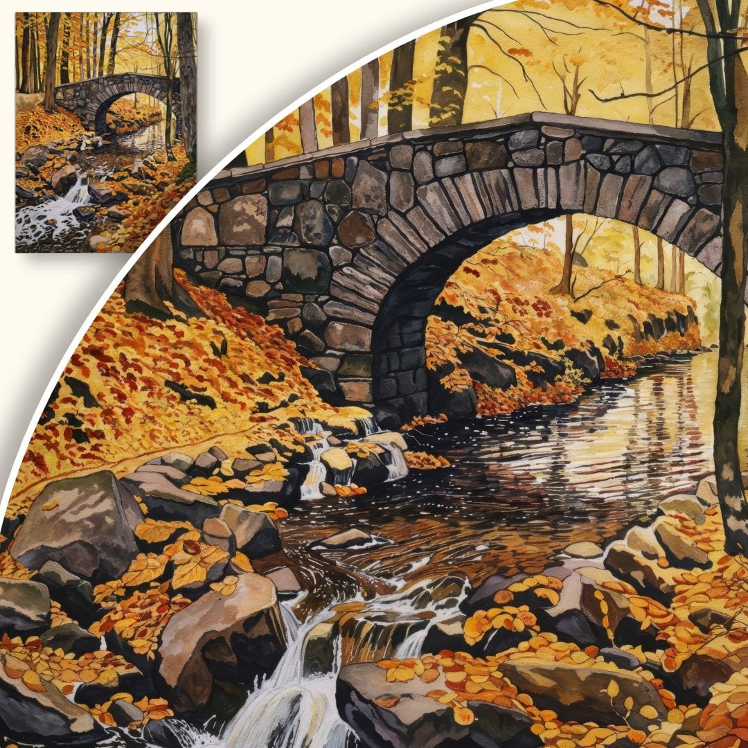 Obraz emanuje spokojem i harmonią. Jesienna scena wywołuje uczucie nostalgii, zapraszając do zadumy i bliskości z naturą. Kamienny most symbolizuje łączność i podróż przez czas, zaś rzeka pod nim – nieustanny nurt życia oraz zmienność pór roku.