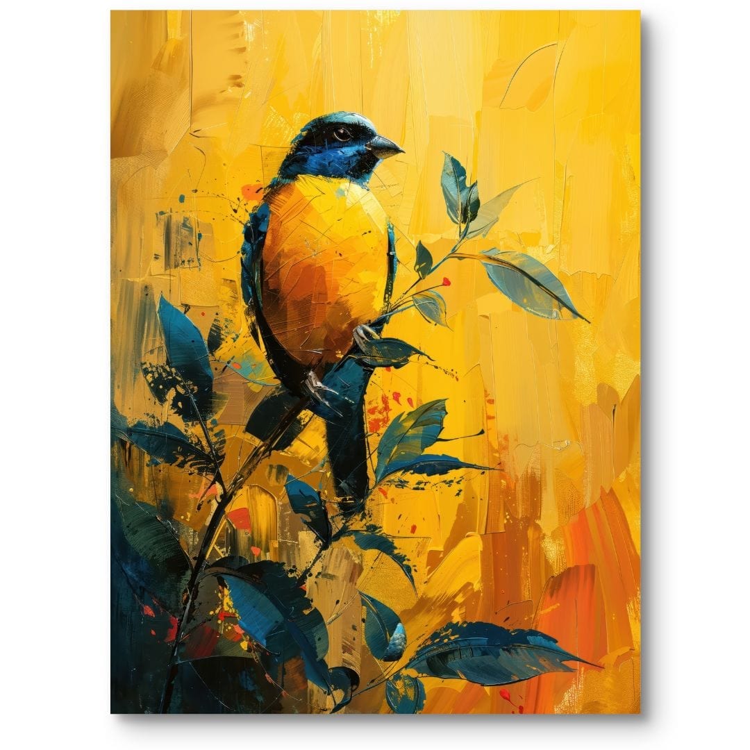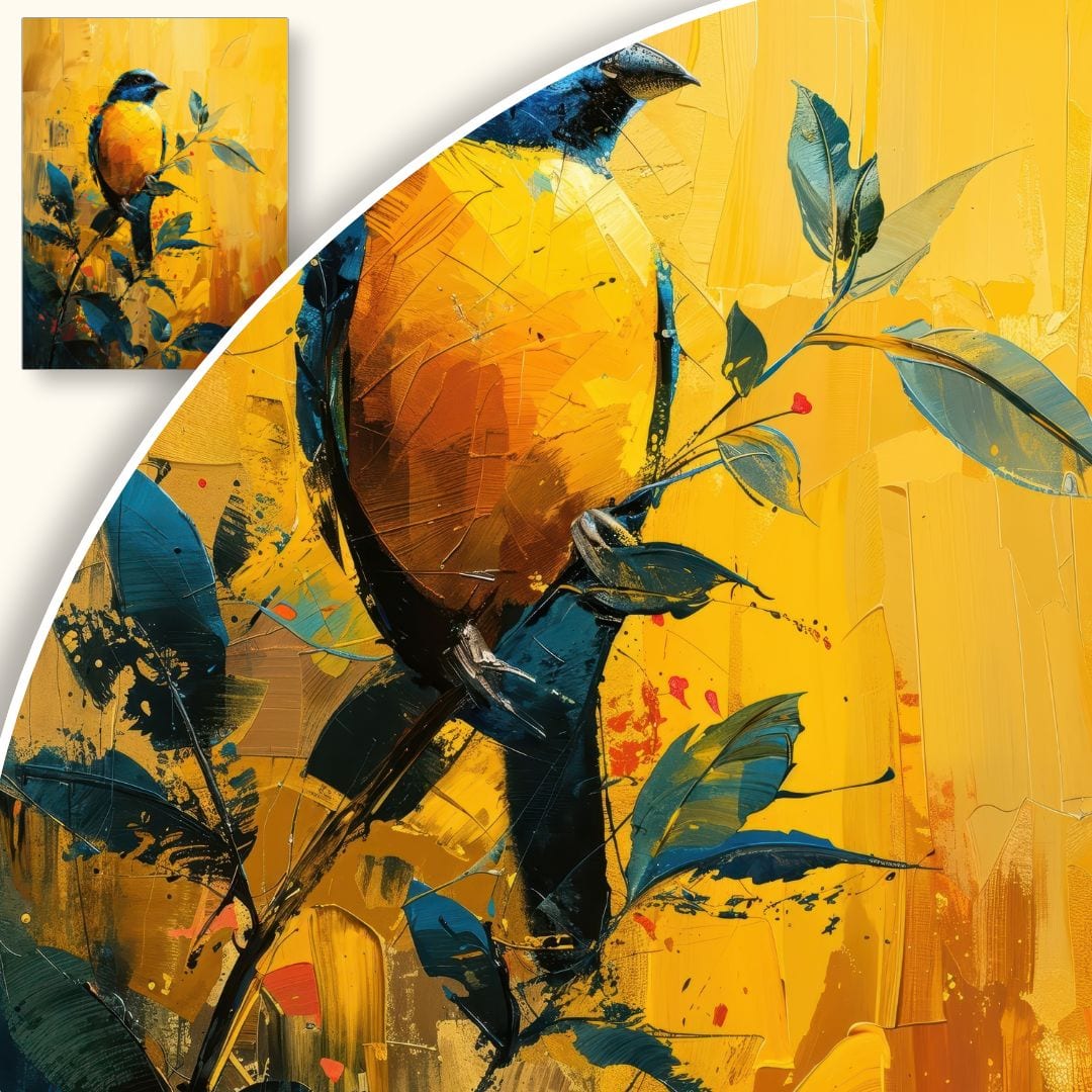 Kompozycja skupia uwagę na głównym bohaterze – ptaku usytuowanym centralnie wśród roślinnych motywów. Dominują ciepłe odcienie żółci i pomarańczy, które budują pogodny klimat i dodają pomieszczeniu energii. Światło subtelnie podkreśla detale ptasiego upierzenia, nadając mu realistyczny, niemal trójwymiarowy wyraz.