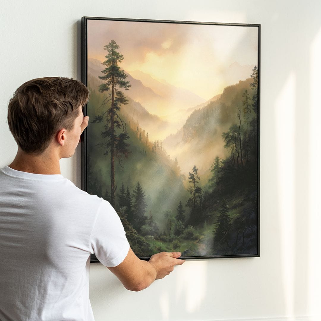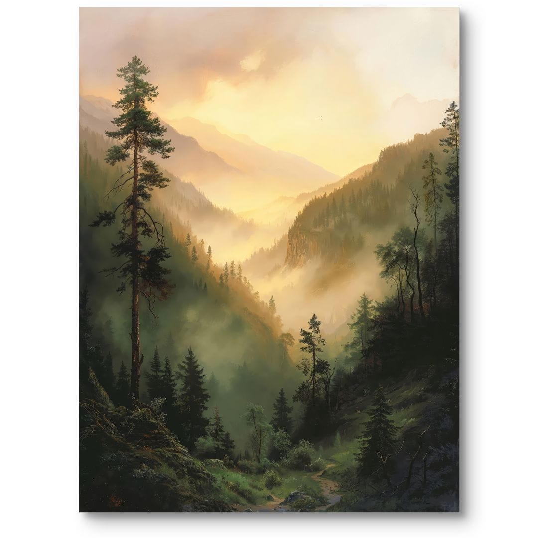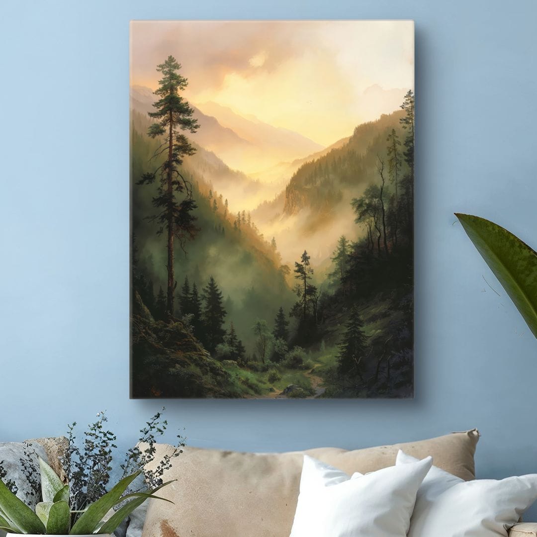 Obraz na płótnie ukazuje zapierający dech w piersiach górski pejzaż skąpany w ciepłych promieniach poranka lub zachodzącego słońca. W centrum kompozycji rozciąga się tajemnicza dolina otoczona majestatycznymi szczytami, porośniętymi bujnymi lasami. Lekka mgiełka unosząca się nad krajobrazem wprowadza aurę niedopowiedzenia, podkreślając naturalną magię tej scenerii. Każde spojrzenie na ten obraz to chwila zatrzymania, refleksji oraz głębokiego kontaktu z naturą.
