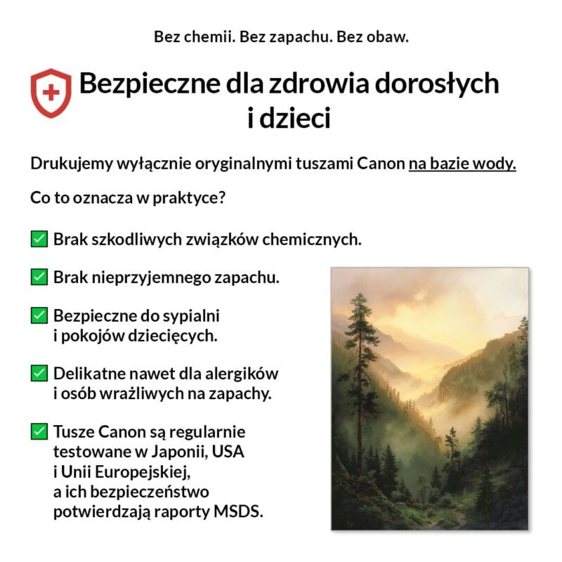 Tak, absolutnie! Drukujemy wyłącznie certyfikowanymi, bezwonnymi tuszami pigmentowymi Canon Lucia Pro na bazie wody. Są one w pełni bezpieczne dla zdrowia, nie zawierają rozpuszczalników i mogą być bez obaw stosowane w sypialniach i pokojach dziecięcych.