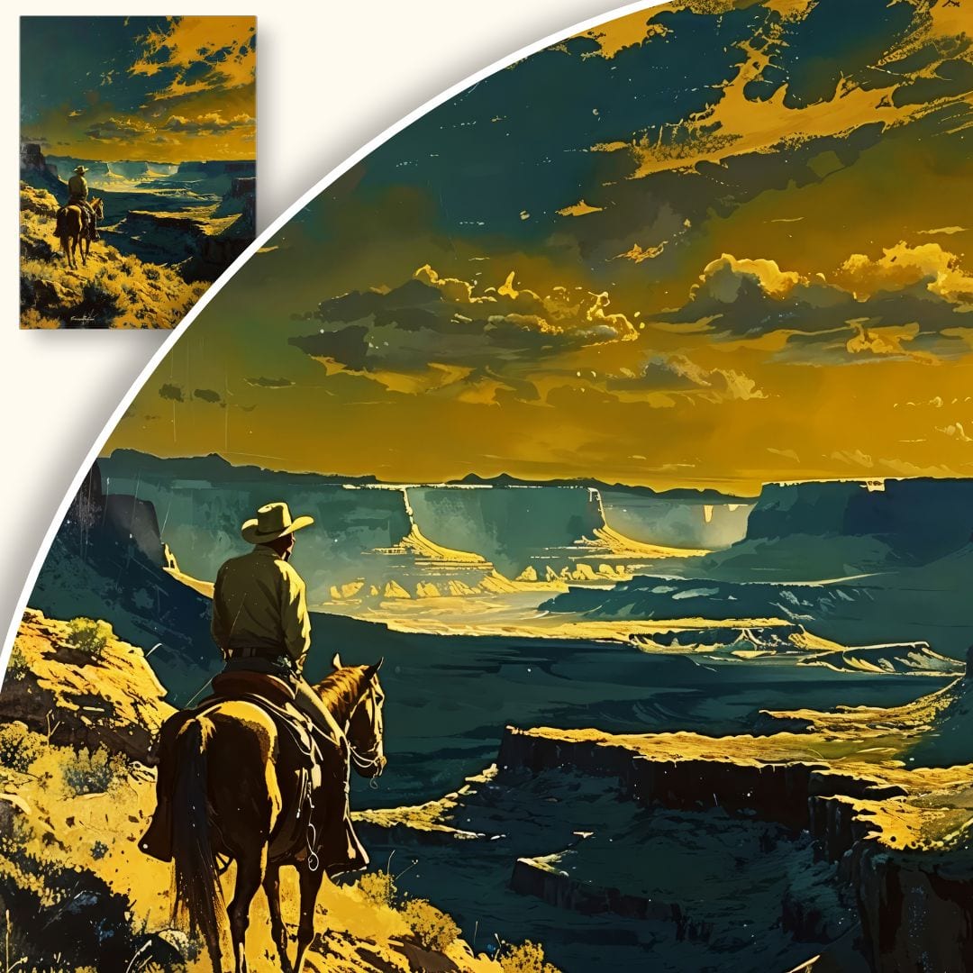 Prezentowany obraz to fascynująca sceneria – jeździec na koniu przemierzający rozległy kanion. Zachwycający widok skalistych ścian pod błękitnym, rozświetlonym niebem i dominujące żółcie oraz intensywne odcienie niebieskiego, budują poczucie nieskończonej przestrzeni oraz dzikiej, urzekającej natury. Idealnie oddana dynamika krajobrazu przyciąga wzrok i inspiruje do marzeń o dalekich podróżach.