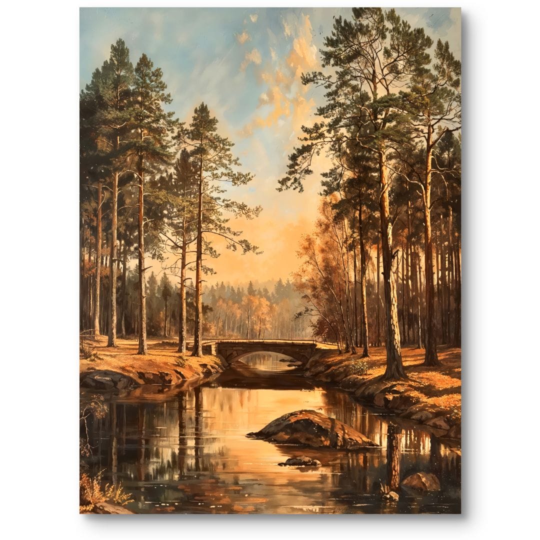 Obraz ukazuje malowniczy krajobraz rzeczny, którego sercem jest spokojnie płynąca rzeka, otulona majestatycznymi drzewami. W tle dostrzec można urokliwy most, a cała scena skąpana jest w ciepłych promieniach zachodzącego słońca. To wyjątkowe dzieło podkreśla harmonię oraz piękno natury, jednocześnie wprowadzając nas w atmosferę wyciszenia i błogości.