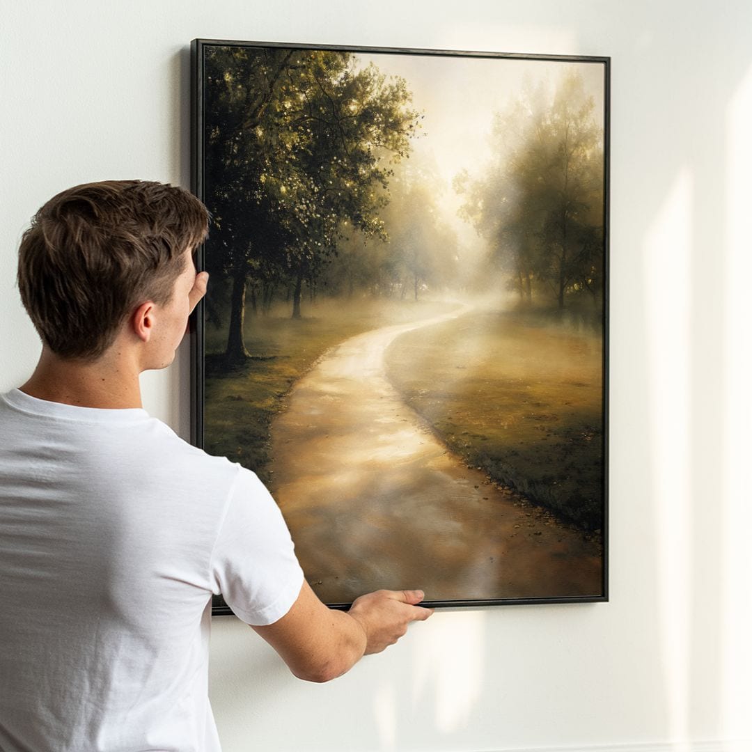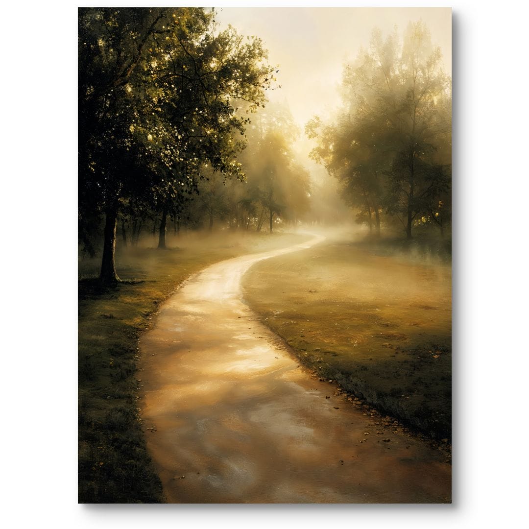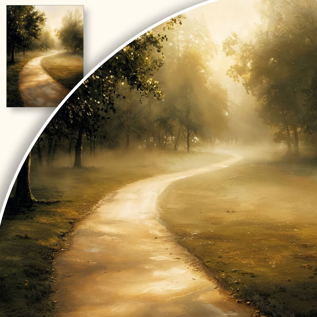 Ten wyjątkowy obraz na płótnie ukazuje spokojną, leśną ścieżkę tonącą we mgle, którą delikatnie otaczają majestatyczne drzewa. Promienie porannego słońca subtelnie przenikają przez liście, tworząc fascynującą grę światła i cieni na miękkim leśnym runie. Dzieło emanuje harmonią oraz spokojem, przywołując atmosferę wyciszenia i bliskości z naturą. To ukłon w stronę natury w jej najbardziej kojącej i relaksującej odsłonie.