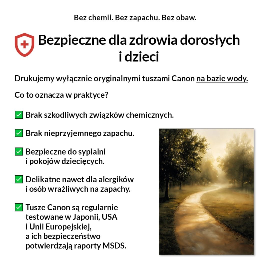 Tak, absolutnie! Drukujemy wyłącznie certyfikowanymi, bezwonnymi tuszami pigmentowymi Canon Lucia Pro na bazie wody. Są one w pełni bezpieczne dla zdrowia, nie zawierają rozpuszczalników i mogą być bez obaw stosowane w sypialniach i pokojach dziecięcych.