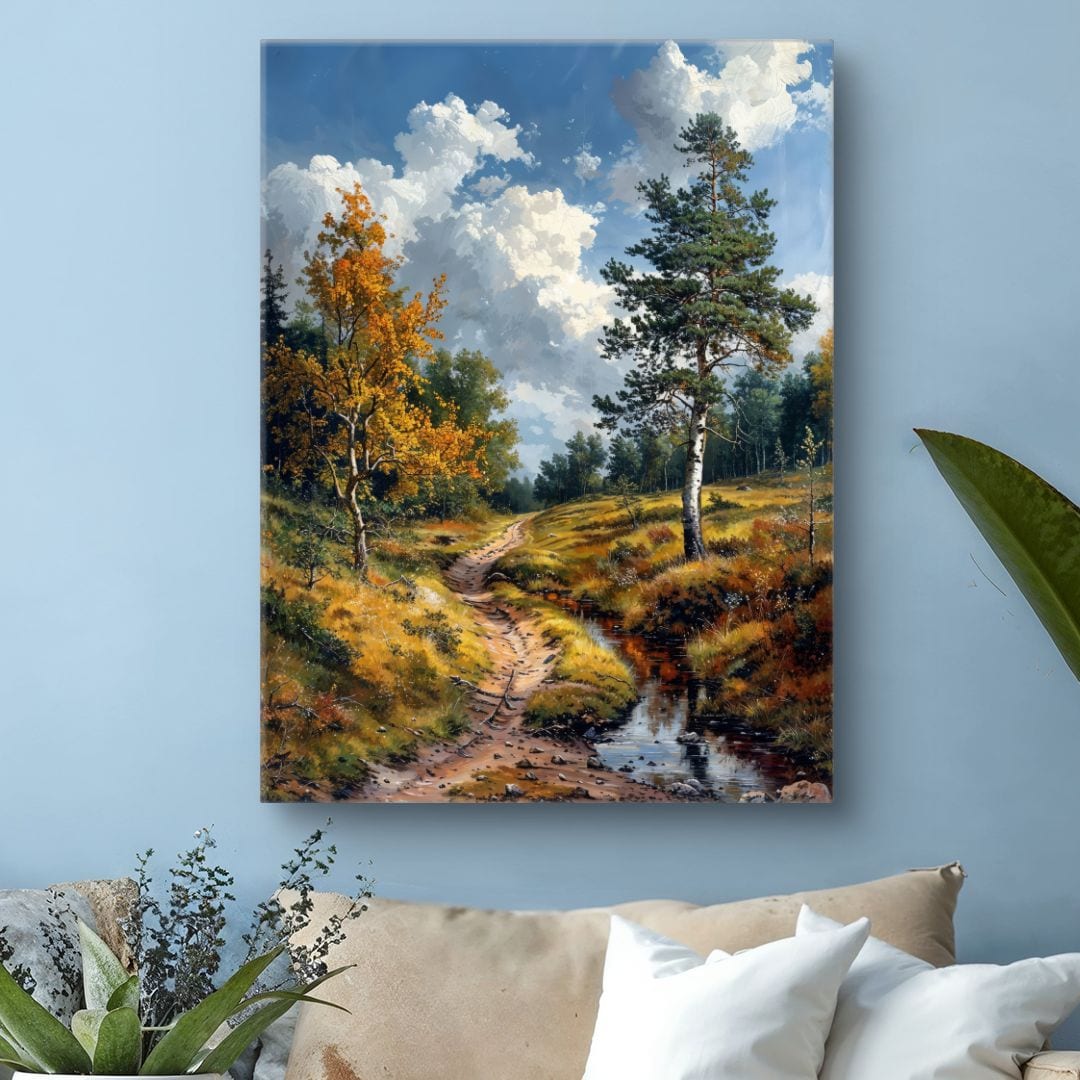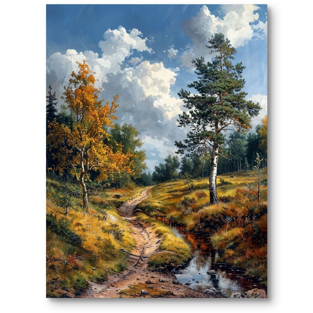 Ten obraz na płótnie ukazuje urzekający, leśny krajobraz, w którym głównymi bohaterami są majestatyczne drzewa, wijąca się ścieżka oraz subtelny strumień przecinający naturalną scenerię. W tle rozciąga się błękitne niebo ozdobione lekkimi, puszystymi obłokami, co podkreśla harmonię i czystość natury. Kompozycja tchnie spokojem i zachwyca miłośników przyrody pięknem codziennych chwil.