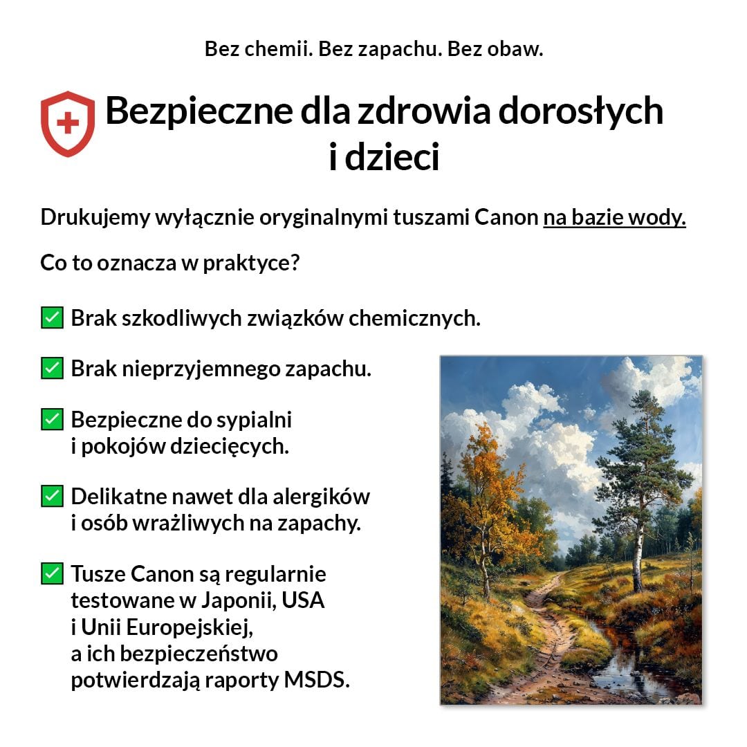 Tak, absolutnie! Drukujemy wyłącznie certyfikowanymi, bezwonnymi tuszami pigmentowymi Canon Lucia Pro na bazie wody. Są one w pełni bezpieczne dla zdrowia, nie zawierają rozpuszczalników i mogą być bez obaw stosowane w sypialniach i pokojach dziecięcych.