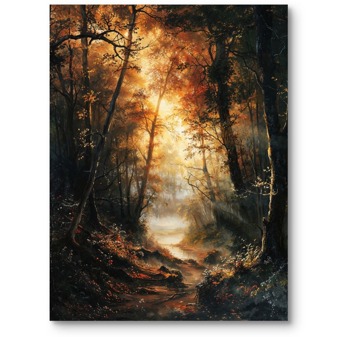Klasyczna kompozycja z centralnie umieszczoną, prowadzącą w głąb lasu ścieżką zachwyca swoją harmonią. Ciepłe, nastrojowe promienie owiewają drzewa, nadając całemu obrazowi aurę spokoju i beztroski. Dominujące barwy – oranż, zieleń i głęboka czerń – zapewniają niezwykłą równowagę oraz subtelny, naturalny efekt kolorystyczny.