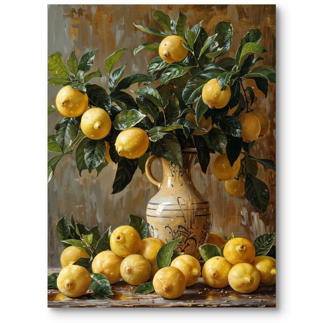 Obraz emanuje pogodą ducha i radosnym nastrojem, wprowadzając do wnętrza atmosferę optymizmu. Cytryny od wieków symbolizują energię, świeżość i zdrowie, a ich umieszczenie w klasycznym wazonie dodaje całości odrobiny luksusu i ponadczasowego stylu.