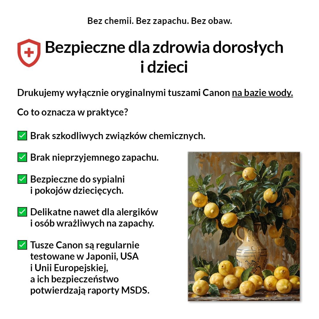 Tak, absolutnie! Drukujemy wyłącznie certyfikowanymi, bezwonnymi tuszami pigmentowymi Canon Lucia Pro na bazie wody. Są one w pełni bezpieczne dla zdrowia, nie zawierają rozpuszczalników i mogą być bez obaw stosowane w sypialniach i pokojach dziecięcych.