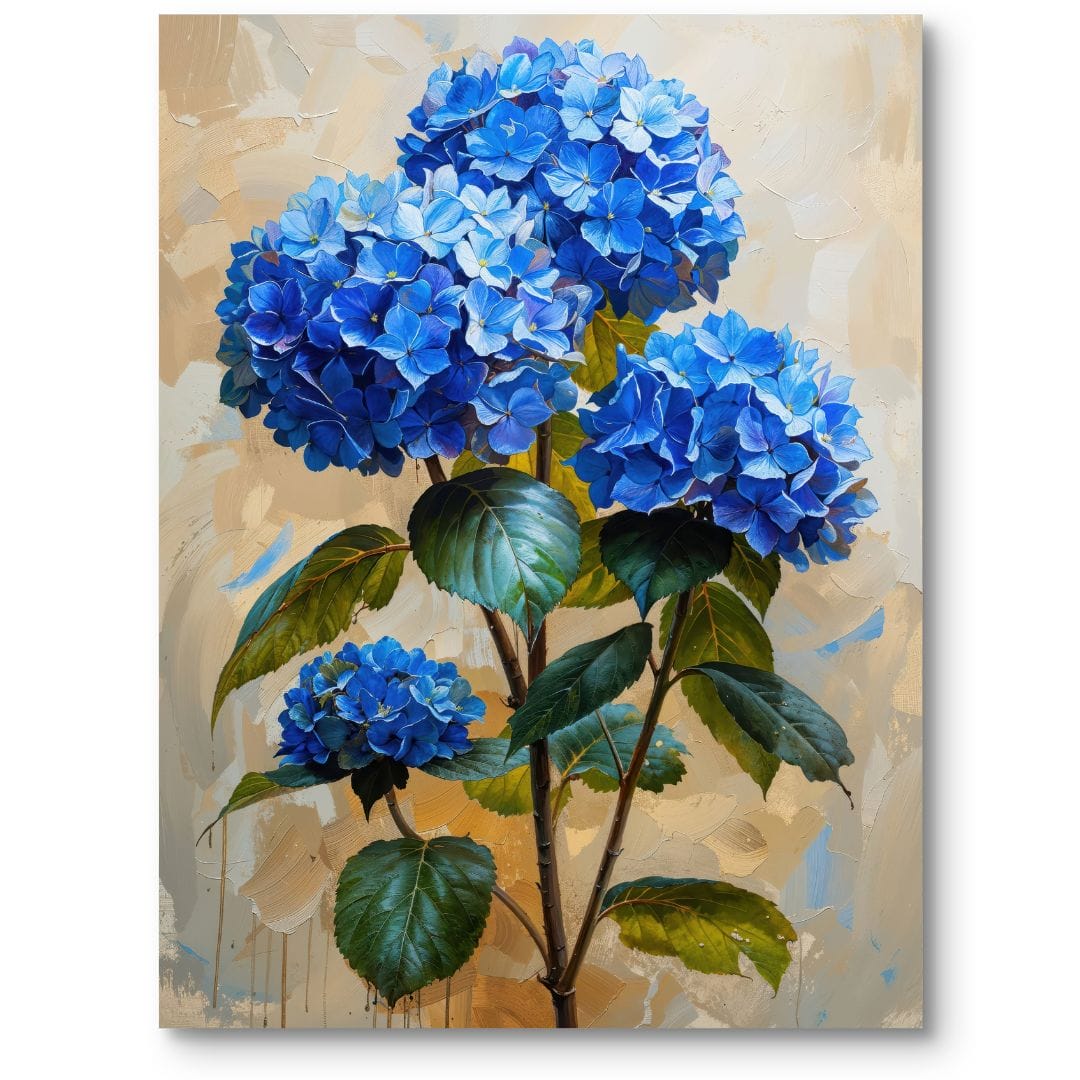 Obraz na płótnie prezentuje niezwykle realistyczne hortensje w pełnej krasie. Kwiaty w różnych odcieniach niebieskiego, subtelnie rozmieszczone na beżowym tle, wprowadzają do wnętrza nutę elegancji i świeżości. To propozycja stworzona z myślą o miłośnikach natury oraz pasjonatach ogrodnictwa. Hortensja, symbol wdzięczności i stylowego piękna, sprawia, że ten obraz doskonale uzupełnia przestrzenie wymagające ciepłego, harmonijnego akcentu.