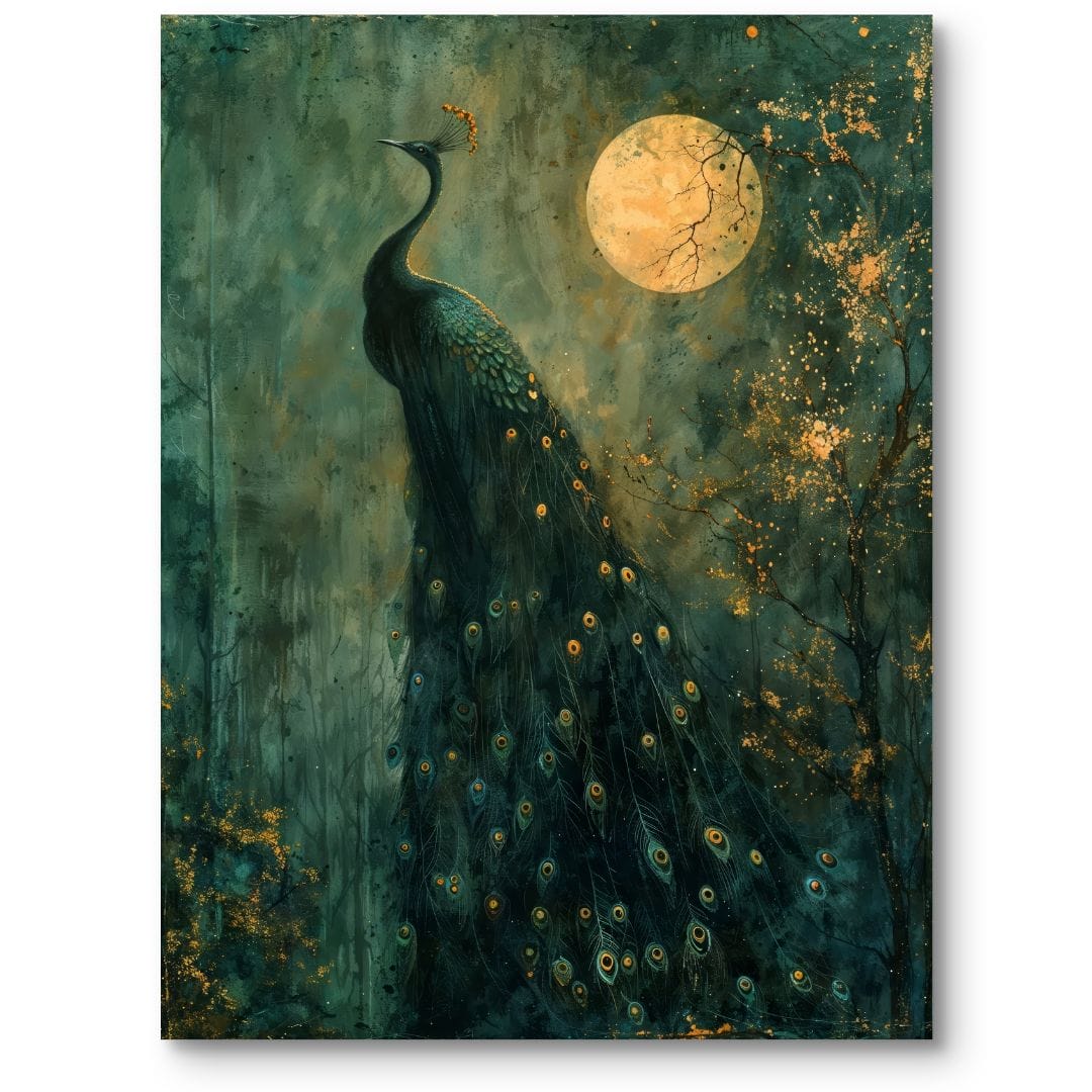 Kompozycja skupia uwagę na centralnej postaci pawia, której przepiękne upierzenie wyraźnie odcina się od ciemnych, głębokich zieleni tła. Silny kontrast z jasnym, złocistym światłem księżyca nadaje obrazowi wyrazistości i podkreśla jego elegancki, wyrafinowany charakter.