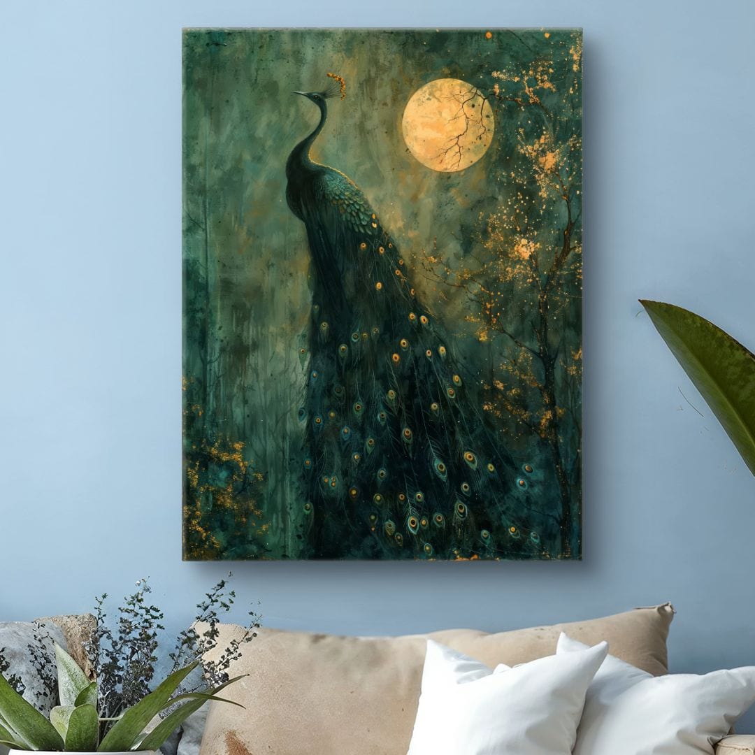 Obraz na płótnie przedstawia majestatycznego pawia w pełnej krasie, rozświetlonego blaskiem księżyca w pełni. Ujęty w mistycznej, nocnej scenerii, paw otoczony jest złocistą poświatą, która nadaje dziełu głębi, magii i niepowtarzalnego uroku.