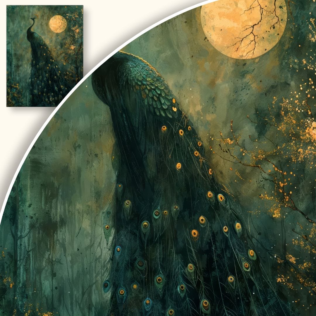 Obraz emanuje nastrojem tajemnicy i magii, przywodząc na myśl nocne wędrówki po zaczarowanych lasach. Paw, symbol piękna, dumy i nieśmiertelności, w połączeniu z pełnią księżyca, tworzy aurę baśniowej głębi i zachęca do osobistych interpretacji oraz kontemplacji.