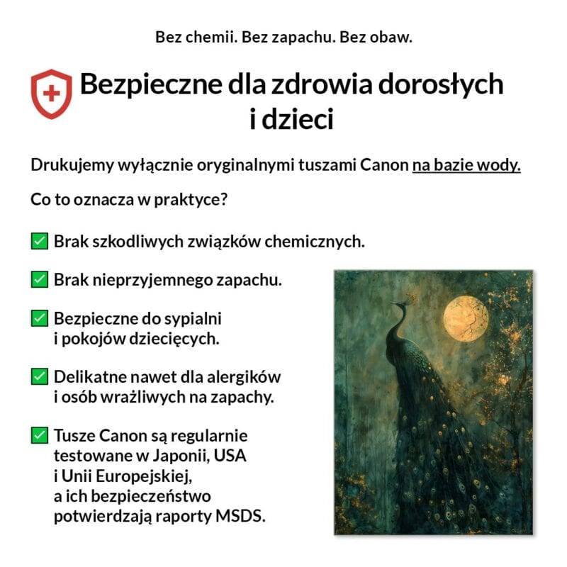 Tak, absolutnie! Drukujemy wyłącznie certyfikowanymi, bezwonnymi tuszami pigmentowymi Canon Lucia Pro na bazie wody. Są one w pełni bezpieczne dla zdrowia, nie zawierają rozpuszczalników i mogą być bez obaw stosowane w sypialniach i pokojach dziecięcych.