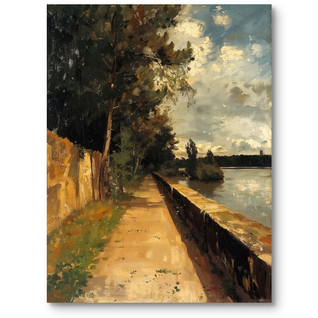 Ten obraz na płótnie przenosi nas w pełen ukojenia krajobraz nad rzeką, gdzie malownicza ścieżka wijąca się wzdłuż brzegu zaprasza do spaceru wśród bujnej zieleni i majestatycznych drzew. Tło stanowi spokojna, błękitna woda oraz subtelnie zachmurzone niebo, które razem kreują harmonijną i wyciszającą scenę.
