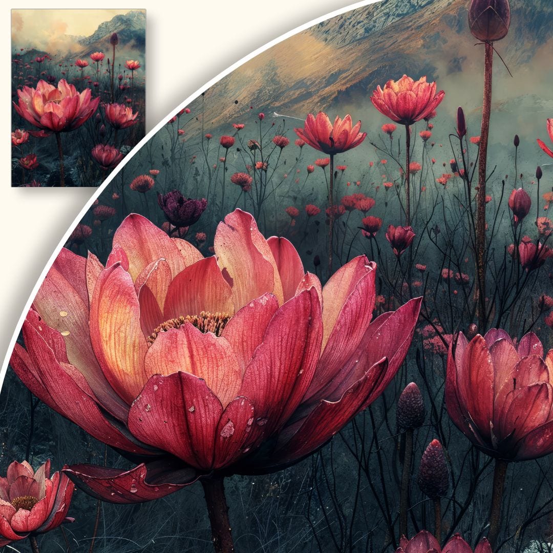 Obraz wypełnia pokój inspirującą atmosferą, przypominając o sile i pięknie otaczającej przyrody. Motyw kwiatów – symbol życia i odrodzenia – w połączeniu z potęgą gór stanowi wyraz trwałości oraz niezmiennej energii natury.