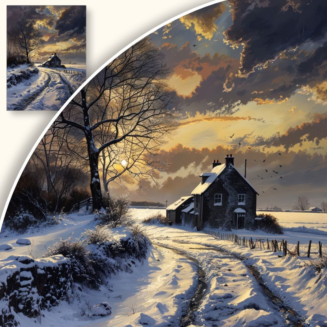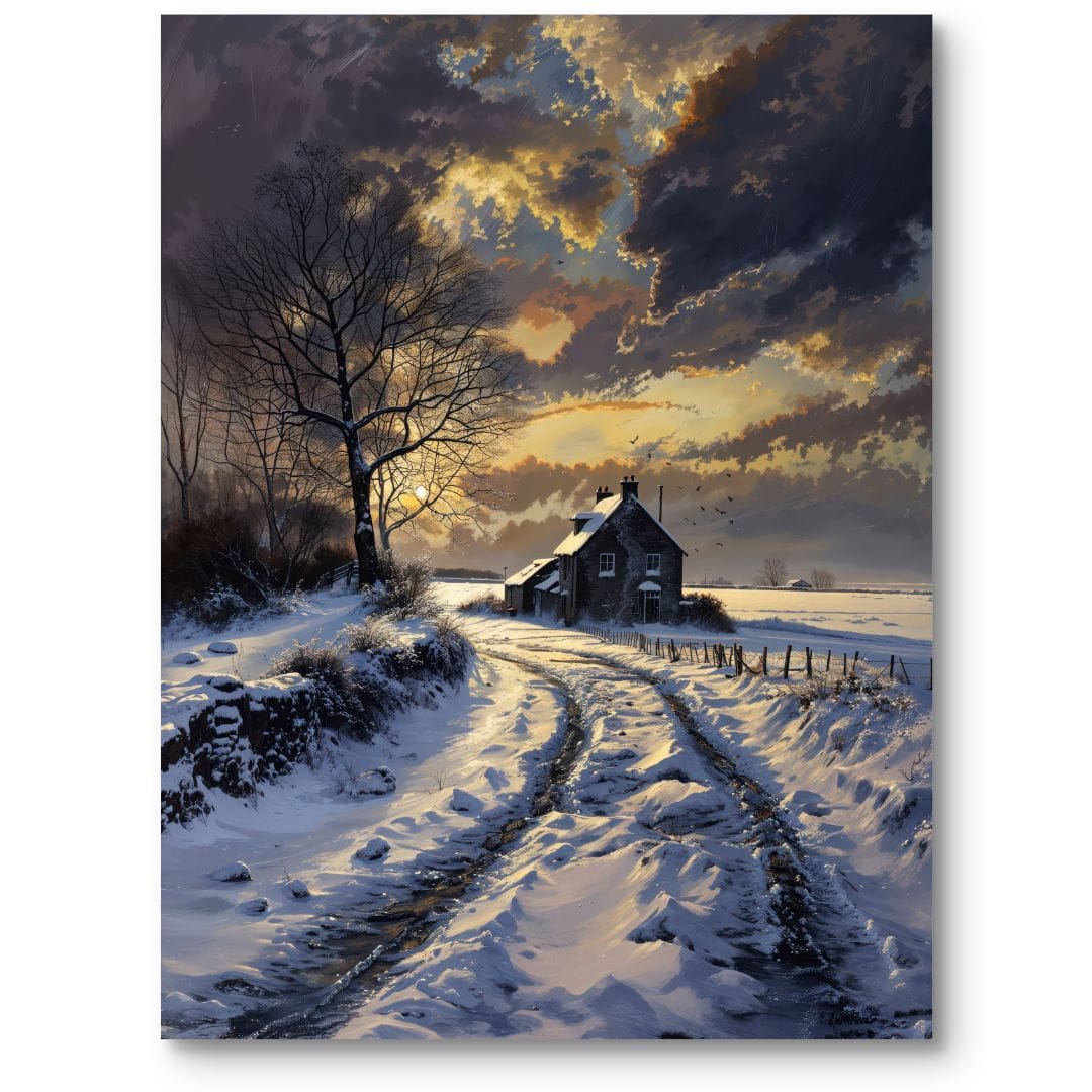 Obraz na płótnie przedstawia nastrojowy, zimowy krajobraz z malowniczym domem wiejskim w samym sercu kompozycji. Otulone śniegiem drogi i okoliczna przyroda roztaczają wokół atmosferę spokoju i zimowego uroku. Na pierwszym planie dostrzec można zasypaną białym puchem drogę prowadzącą do ciepłego, przytulnego domku, otulonego drzewami oraz polami, które tworzą harmonijną całość.