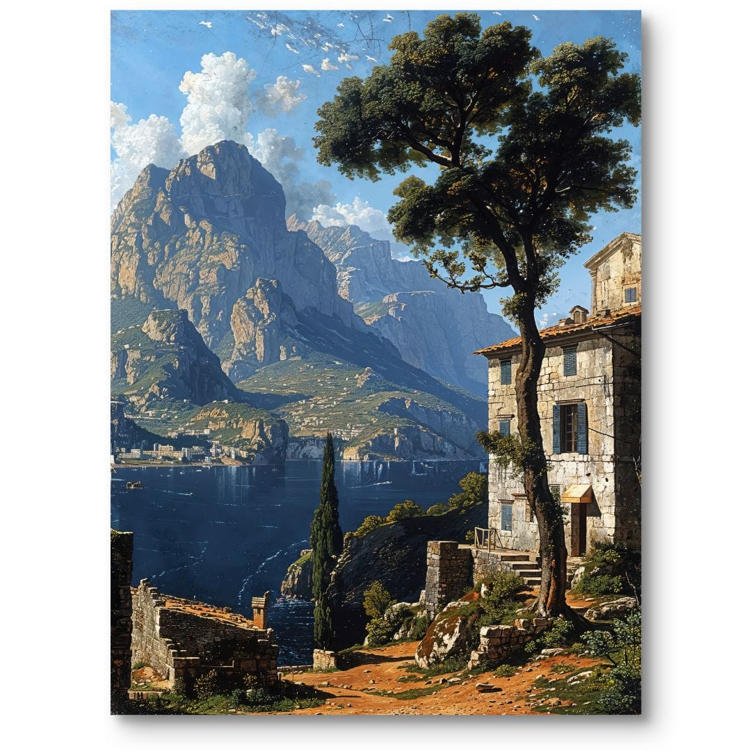 Obraz na płótnie przenosi widza w malowniczy świat górskiego pejzażu z przejrzystym jeziorem w tle. Na pierwszym planie zachwyca detalicznie odwzorowana stara architektura otulona zielenią drzew, które wprowadzają do kompozycji świeżość i naturalny wdzięk. W tle majestatyczne szczyty, odbijające się w spokojnej tafli wody, budują niezwykłą przestrzeń i głębię. Artysta umiejętnie uchwycił piękno niezakłóconej natury oraz bogactwo detali fauny i flory, dzięki czemu odbiorca może poczuć się niemal uczestnikiem tego magicznego miejsca.