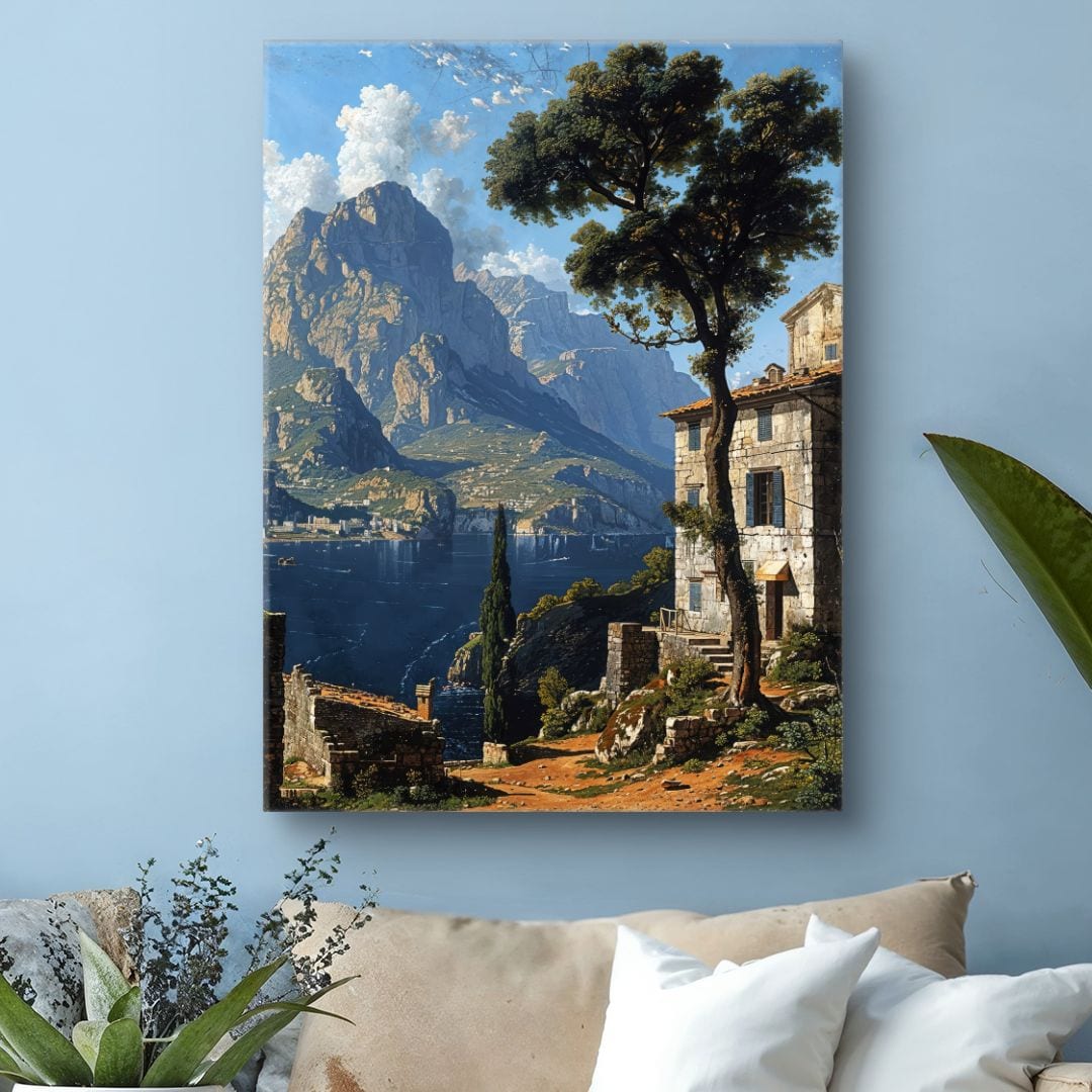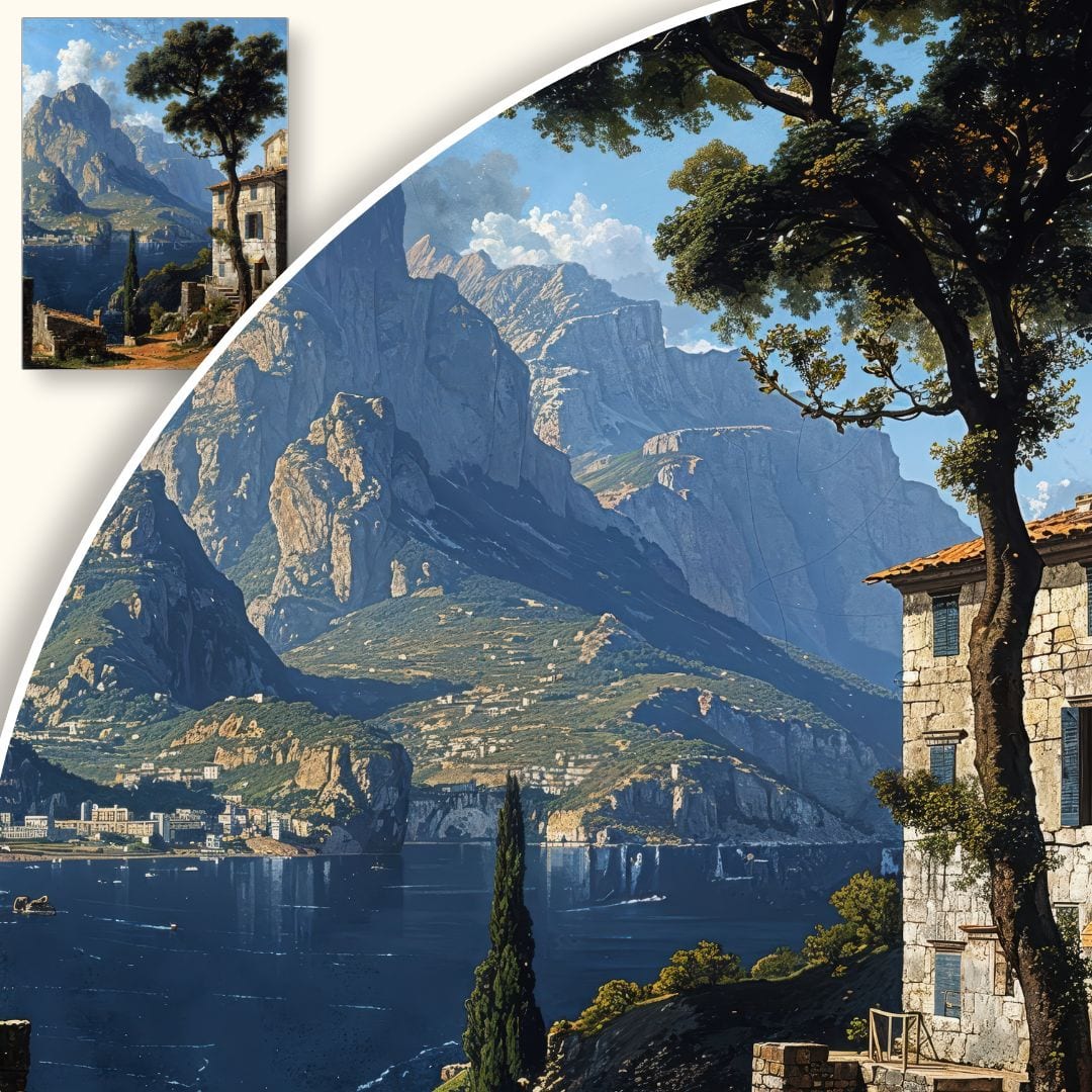 Obraz emanuje ciszą, spokojem i harmonią, sprzyjając głębokiej refleksji i wyciszeniu. Na płótnie odnajdujemy symbolikę równowagi człowieka z naturą oraz ponadczasowego piękna krajobrazu. Zabytkowe elementy architektoniczne przywodzą na myśl nostalgię za dawnymi czasami, a majestatyczne góry mogą być metaforą siły, trwałości i niezmiennego piękna przyrody.