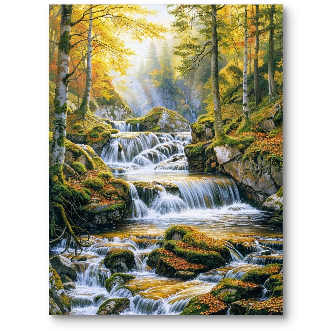 Centralnie umieszczony wodospad przyciąga wzrok, a promienie słońca przenikające przez korony drzew tworzą złociste refleksy na powierzchni wody i liściach. Dominujące odcienie zieleni, żółci i bieli budują atmosferę lekkości oraz świeżości, inspirując do relaksu i napełniając przestrzeń optymizmem.