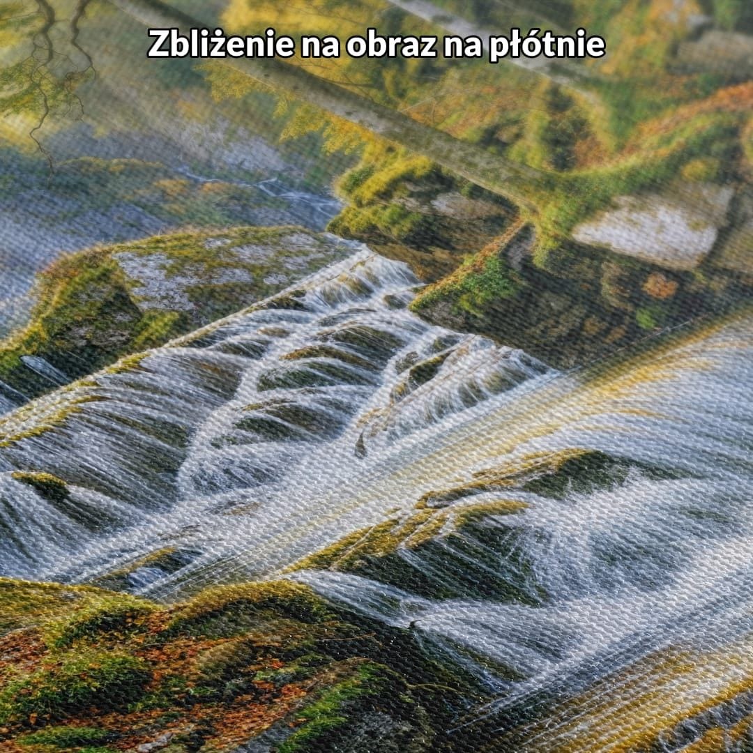 Obraz na płótnie prezentuje malowniczy krajobraz z majestatycznym wodospadem otoczonym przez soczystą, leśną zieleń. Wyraziste, zielono-żółte barwy wprowadzają świeżość i energię, sprawiając, że natura tętni tu życiem. Detale takie jak drzewa, omszałe kamienie oraz przejrzysta, rześka woda harmonijnie łączą się, tworząc kompozycję zachęcającą do zatrzymania się i kontemplacji.