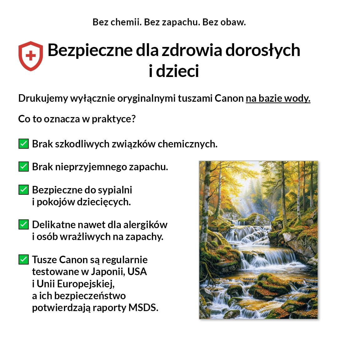 My drukujemy wyłącznie na pigmentowych tuszach Canon LUCIA PRO, bezpiecznych, bezzapachowych i certyfikowanych.