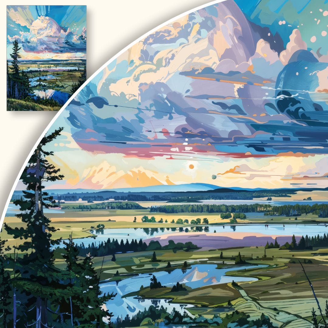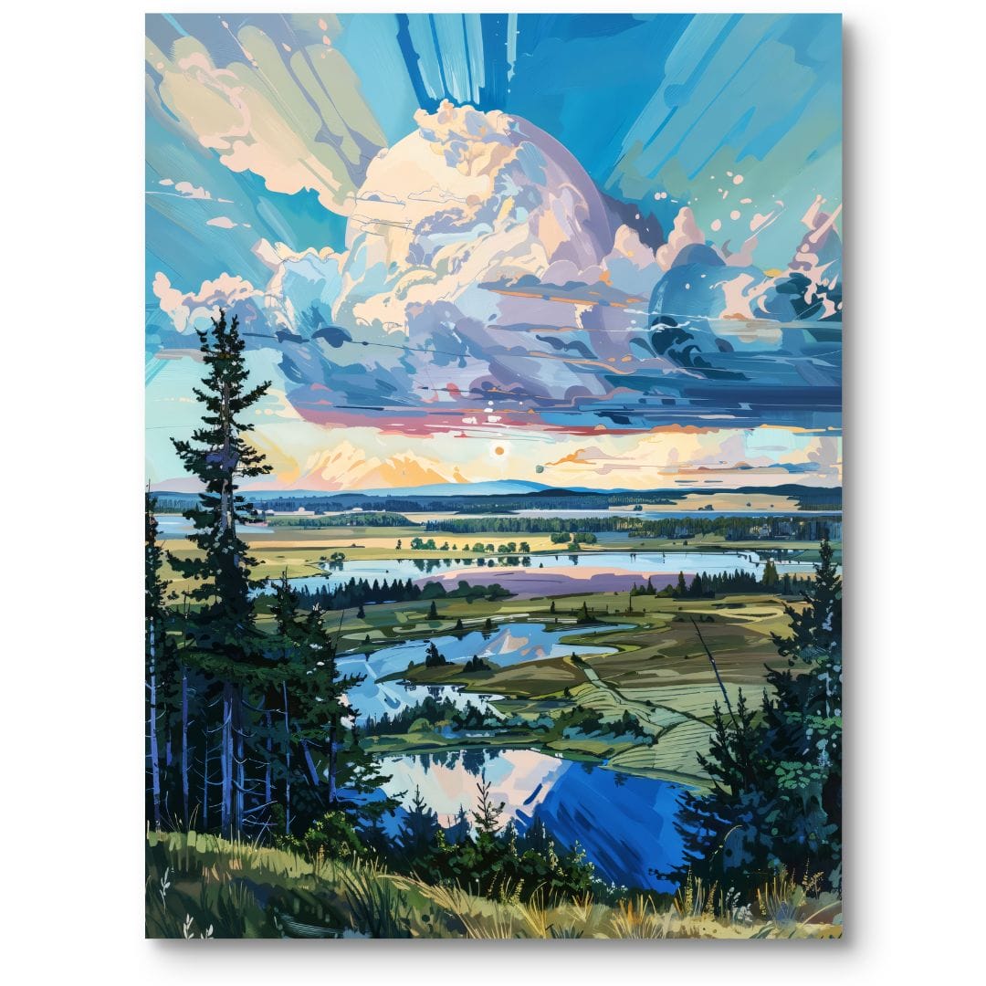 Ten obraz przenosi widza nad rozległe, spokojne jezioro, otulone zielonymi polami i majestatycznymi lasami. Na pierwszym planie dominują smukłe, wysokie drzewa, a dynamiczne obłoki na tle nieba nadają kompozycji wyrazistości. To dzieło łączy w sobie harmonię natury z głębokim poczuciem spokoju, czyniąc każdą przestrzeń bardziej relaksującą i pełną życia.