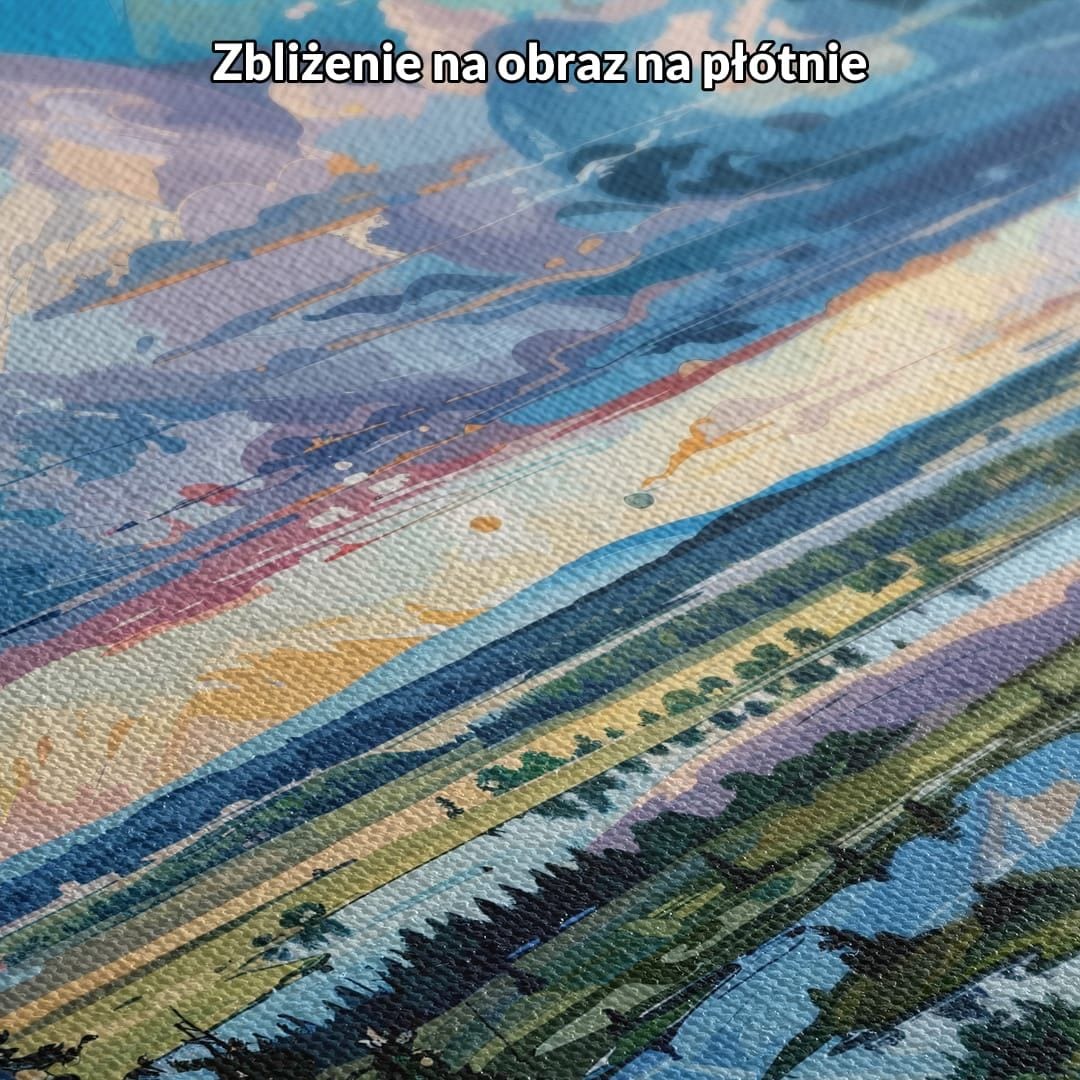 Obraz na płótnie stworzony został w impresjonistycznym stylu, wykorzystując subtelne pociągnięcia pędzla i bogatą paletę kolorów. Użycie farb akrylowych pozwoliło na uzyskanie intensywnych barw oraz płynnych przejść tonalnych – wszystko to oddaje ulotny charakter pejzażu.