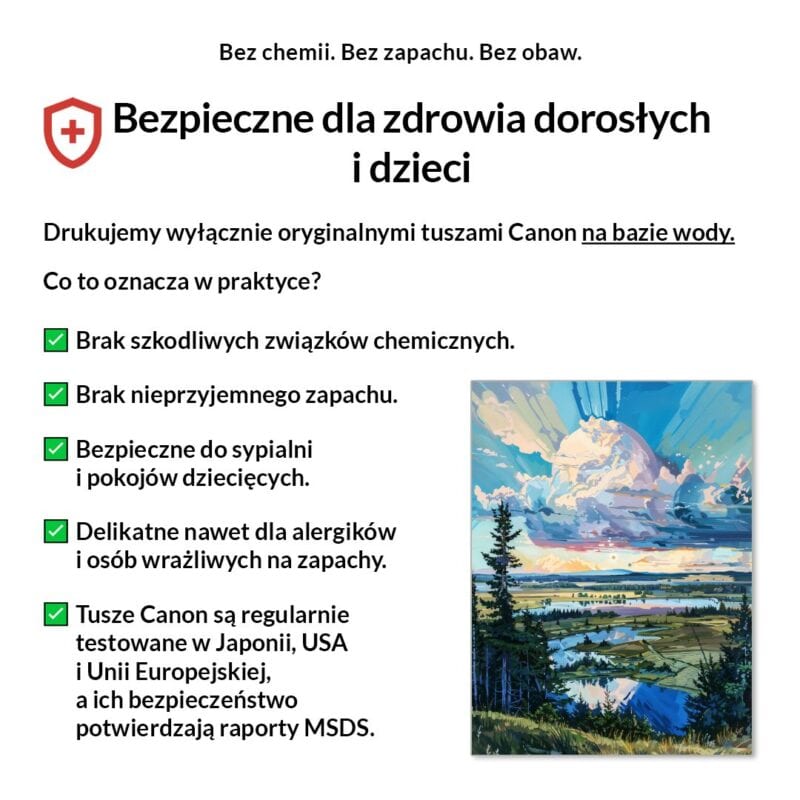 Tak, absolutnie! Drukujemy wyłącznie certyfikowanymi, bezwonnymi tuszami pigmentowymi Canon Lucia Pro na bazie wody. Są one w pełni bezpieczne dla zdrowia, nie zawierają rozpuszczalników i mogą być bez obaw stosowane w sypialniach i pokojach dziecięcych.