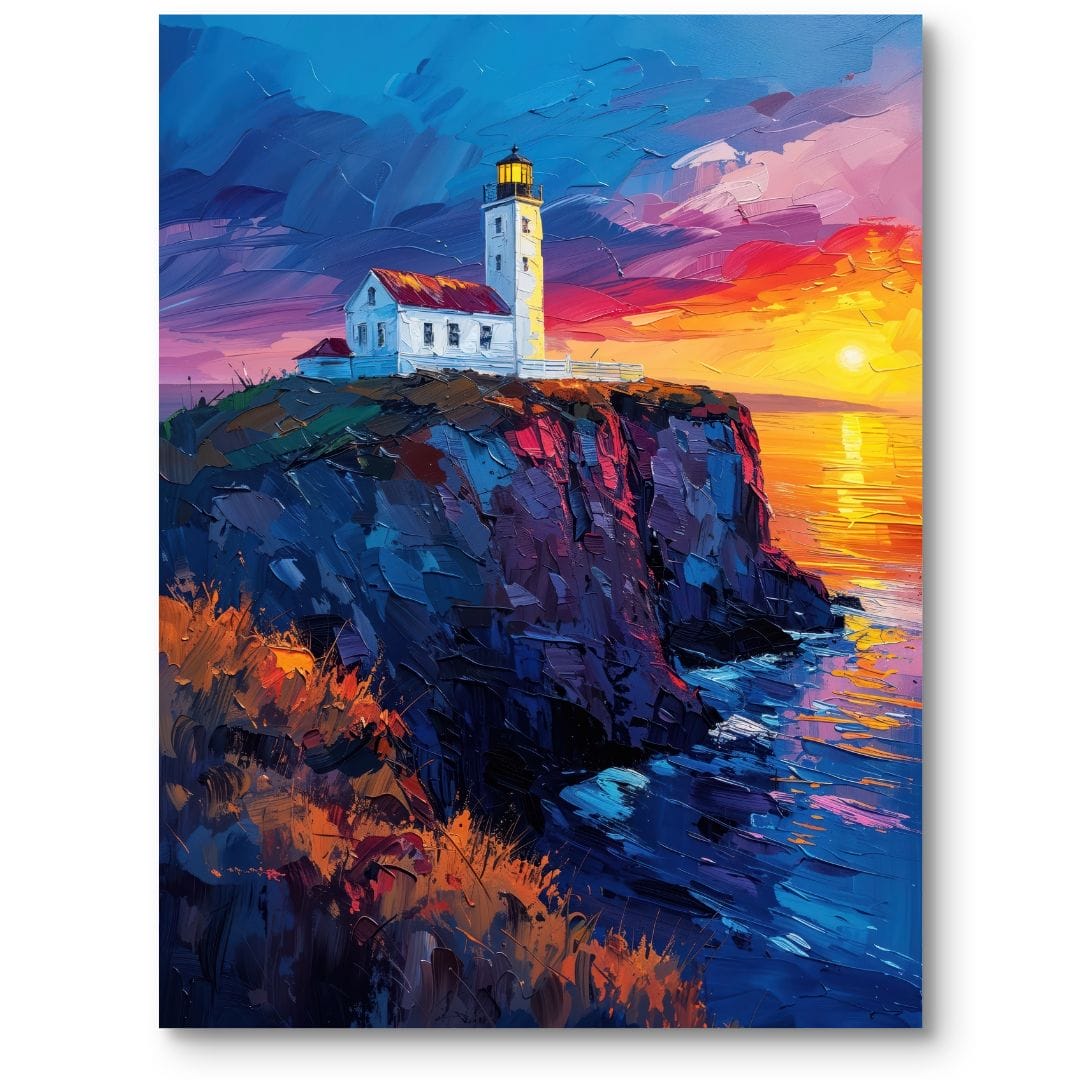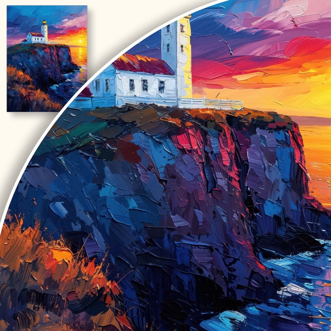 Kompozycja obrazu została zaprojektowana z niezwykłą starannością – centralnie umieszczona latarnia morska skupia na sobie uwagę, podczas gdy światło zachodzącego słońca wprowadza grę świateł, podkreślając kontrasty kolorystyczne. Pomarańczowe i fioletowe akcenty chmur płynnie przechodzą w głębokie odcienie błękitu morza, tworząc harmonijny dialog pomiędzy ciepłem i chłodem tej malarskiej wizji.