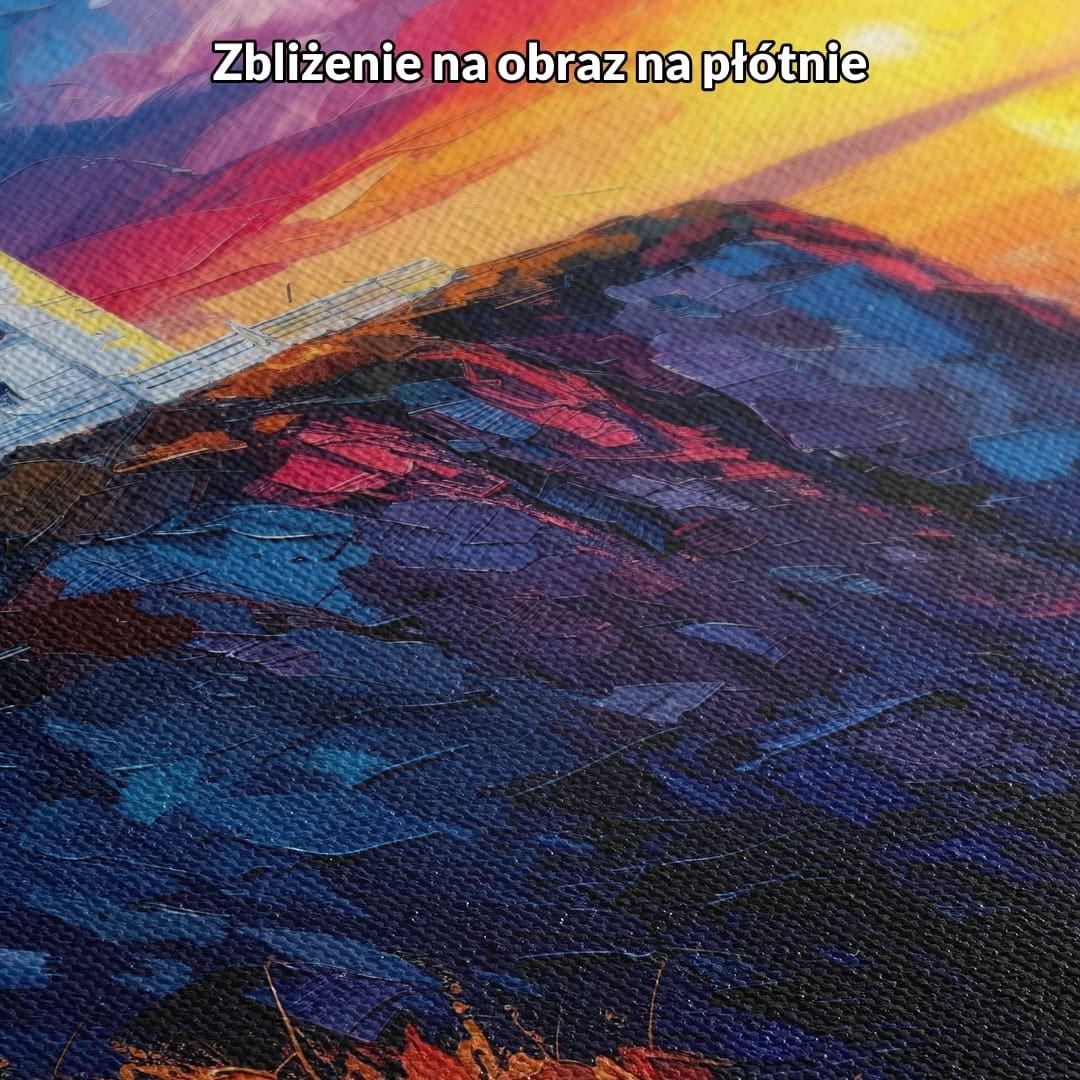 Prezentowany obraz na płótnie ukazuje urzekający morski pejzaż z majestatyczną latarnią morską wznoszącą się na klifie podczas zachodu słońca. Ta wyjątkowa scena zachwyca magią złotej godziny, otulając całość ciepłym, pełnym emocji światłem. Latarnia morska, będąca sercem kompozycji, przyciąga wzrok i staje się symbolem bezpieczeństwa oraz przewodnictwa pośród nieokiełznanych fal i kolorowego nieba. To niepowtarzalne połączenie detali morskiego krajobrazu tworzy prawdziwą ucztę dla zmysłów i buduje atmosferę pełną marzeń i refleksji.