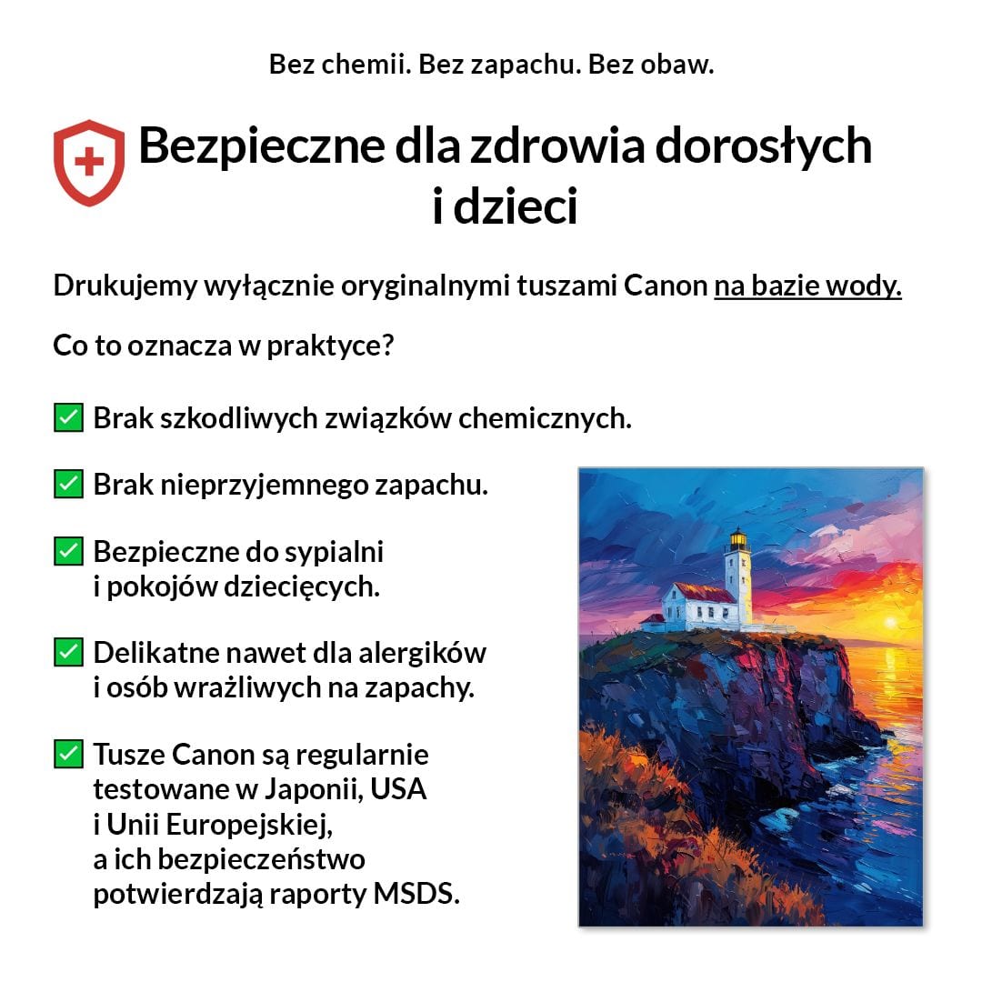 My drukujemy wyłącznie na pigmentowych tuszach Canon LUCIA PRO, bezpiecznych, bezzapachowych i certyfikowanych.