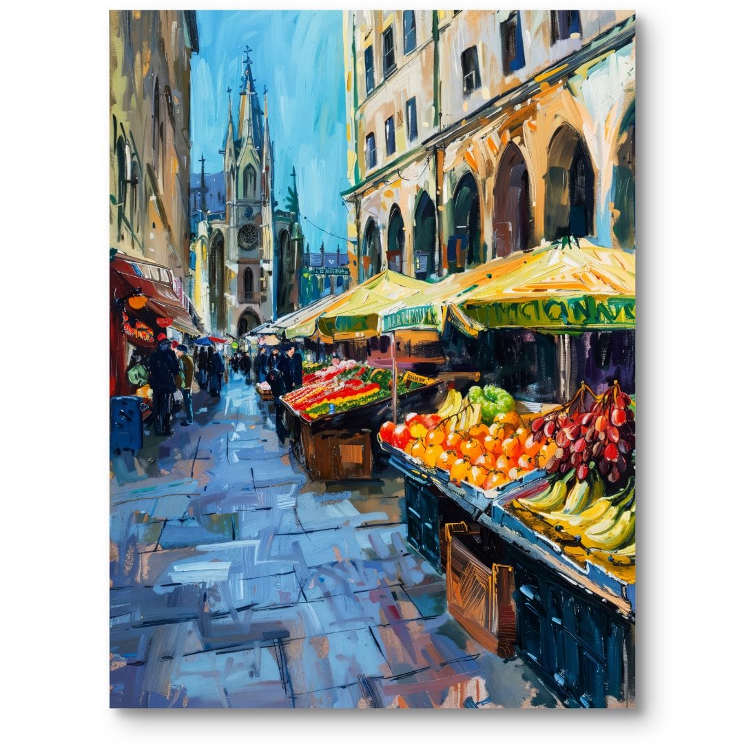 Obraz na płótnie prezentuje urokliwą, malowniczą scenę targowiska w europejskim mieście. Liczne, kolorowe stragany z owocami i warzywami tętnią życiem, zachęcając do zakupów swoim bogactwem barw. W tle majestatyczna katedra dodaje głębi kompozycji oraz wprowadza wyjątkowy kontekst historyczny i kulturowy. Miejski krajobraz umiejętnie łączy architekturę z codziennością mieszkańców, wprowadzając aurę energii oraz autentyczności.