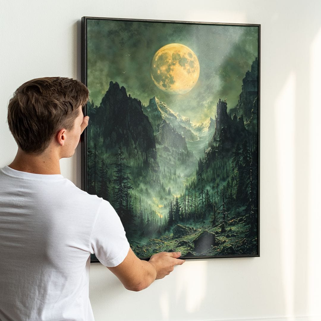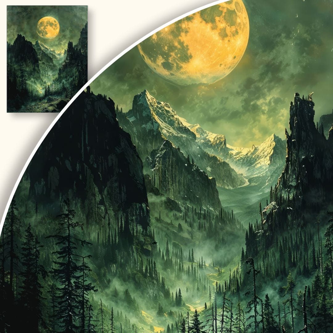 Ten niezwykły obraz na płótnie ukazuje magiczny nocny krajobraz, którego głównym bohaterem jest pełny, jasny księżyc majestatycznie unoszący się nad surowymi, skalistymi szczytami. Otoczenie gęstego, tajemniczego lasu wzmacnia atmosferę niepokoju i spokoju zarazem. Złocisty blask księżyca malowniczo oświetla otaczającą scenerię, tworząc intrygujący kontrast z mrocznymi tonami natury.