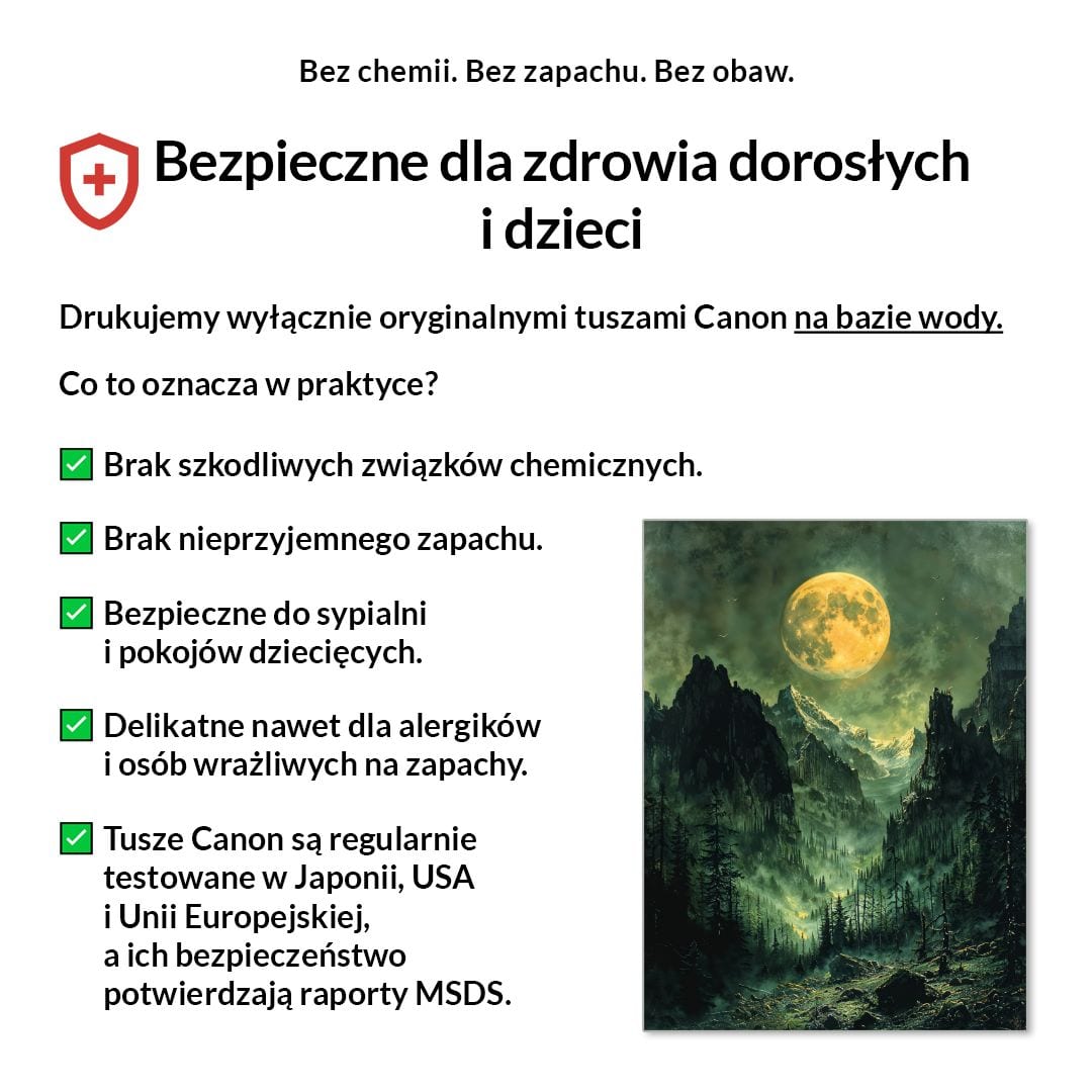 Tak, absolutnie! Drukujemy wyłącznie certyfikowanymi, bezwonnymi tuszami pigmentowymi Canon Lucia Pro na bazie wody. Są one w pełni bezpieczne dla zdrowia, nie zawierają rozpuszczalników i mogą być bez obaw stosowane w sypialniach i pokojach dziecięcych.