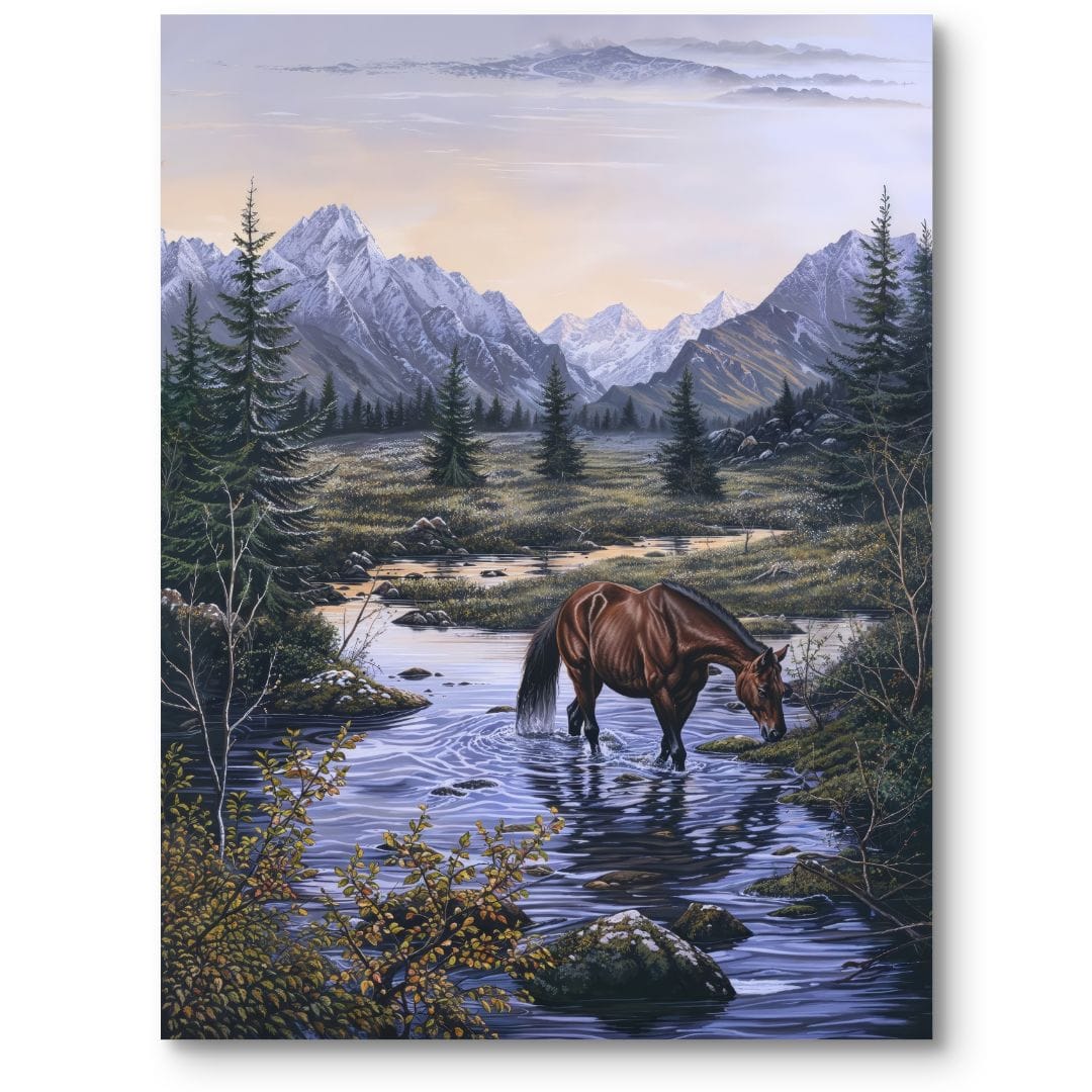 Ten obraz na płótnie przenosi widza w spokojny, górski krajobraz, gdzie koń pochylił się nad krystalicznie czystym potokiem, by zaczerpnąć wody. W tle majestatyczne szczyty gór oraz strzeliste drzewa iglaste tworzą harmonijną, naturalną scenerię pełną uroku i równowagi. Dopracowane detale oraz realistyczne przedstawienie sprawiają, że można niemal poczuć atmosferę dzikiej przyrody.