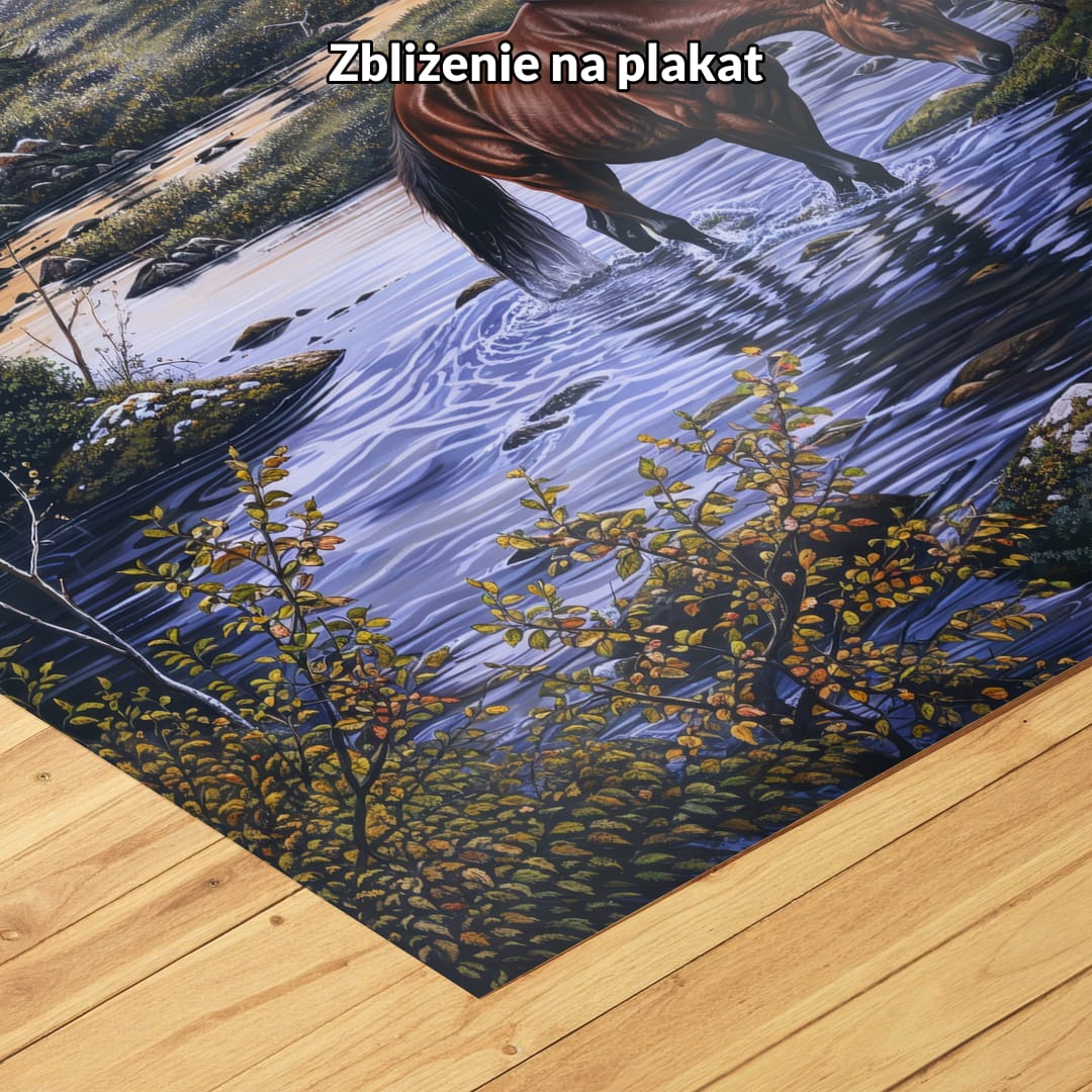 Przemyślana kompozycja prowadzi wzrok ku centralnej postaci konia i dynamicznie płynącemu potokowi. Dominujące zielenie otaczającego krajobrazu wprowadzają harmonię i ukojenie, a niebieska woda oraz ciepłe brązy sierści konia dodają wyrazistości i głębi. Delikatne, naturalne światło subtelnie podkreśla najważniejsze elementy obrazu, budując wyciszającą aurę.