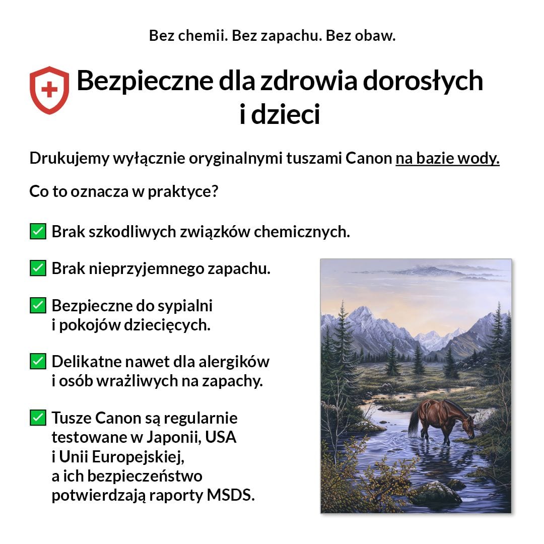Tak, absolutnie! Drukujemy wyłącznie certyfikowanymi, bezwonnymi tuszami pigmentowymi Canon Lucia Pro na bazie wody. Są one w pełni bezpieczne dla zdrowia, nie zawierają rozpuszczalników i mogą być bez obaw stosowane w sypialniach i pokojach dziecięcych.