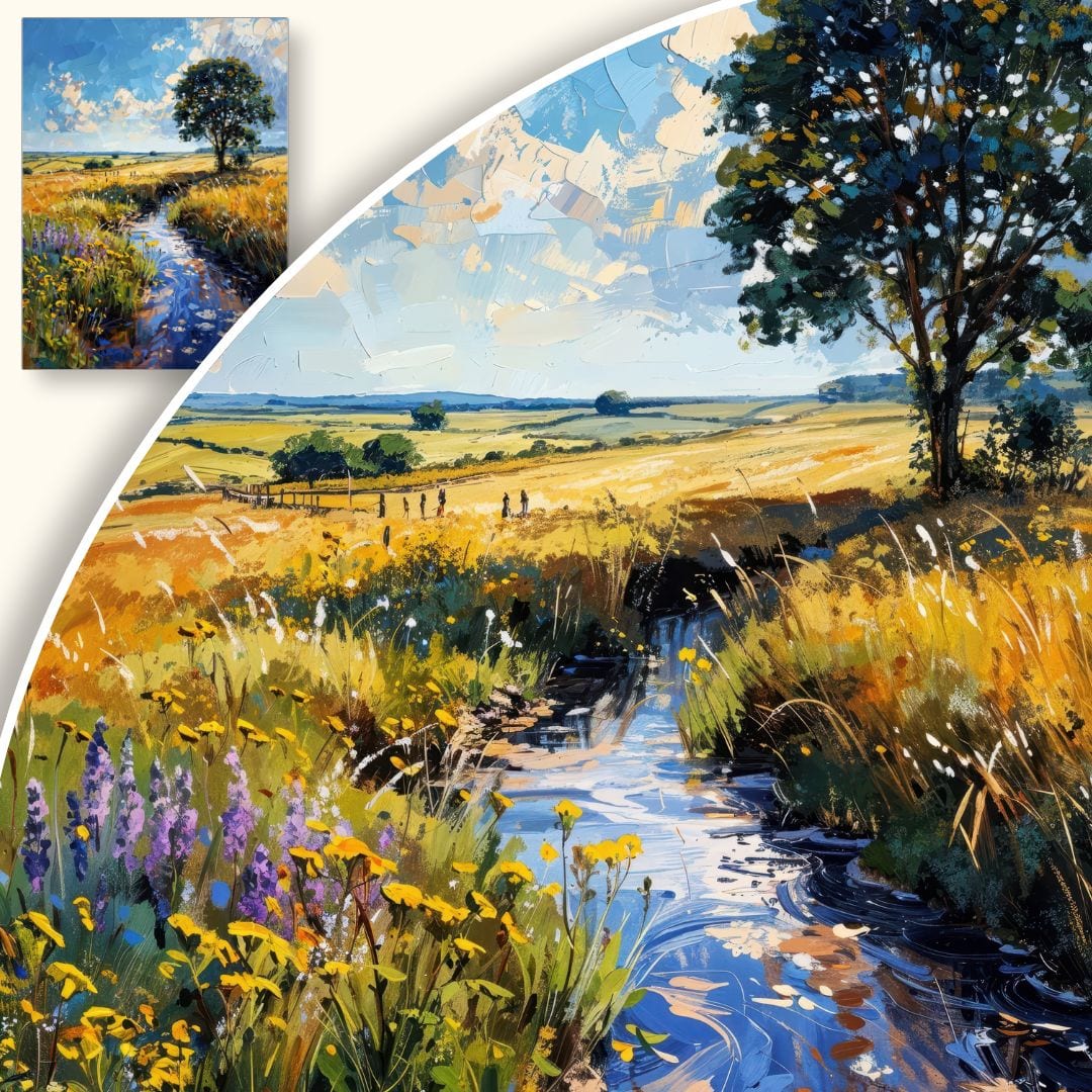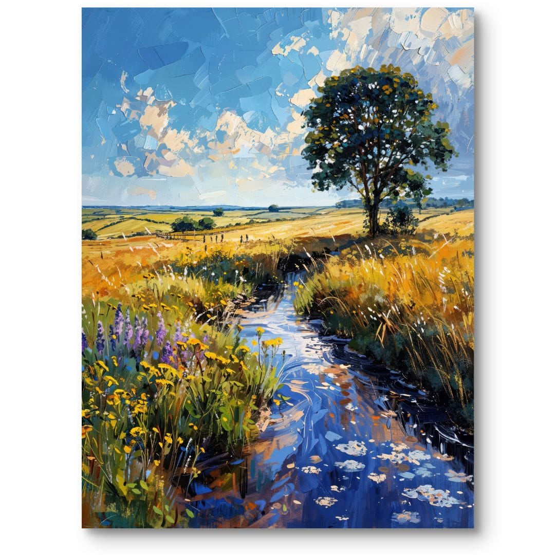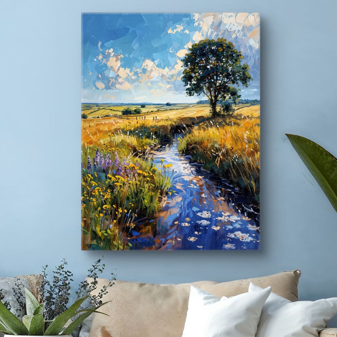 Obraz na płótnie ukazuje urzekający wiejski krajobraz, w centrum którego dominuje majestatyczne drzewo, otulone w meandrujący strumień. W tle rozpościerają się łagodne połacie pól aż po sam horyzont, tworząc kojącą scenerię, która zaprasza do chwil refleksji i odpoczynku.