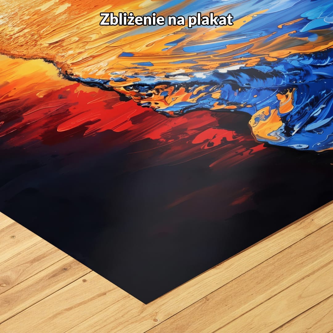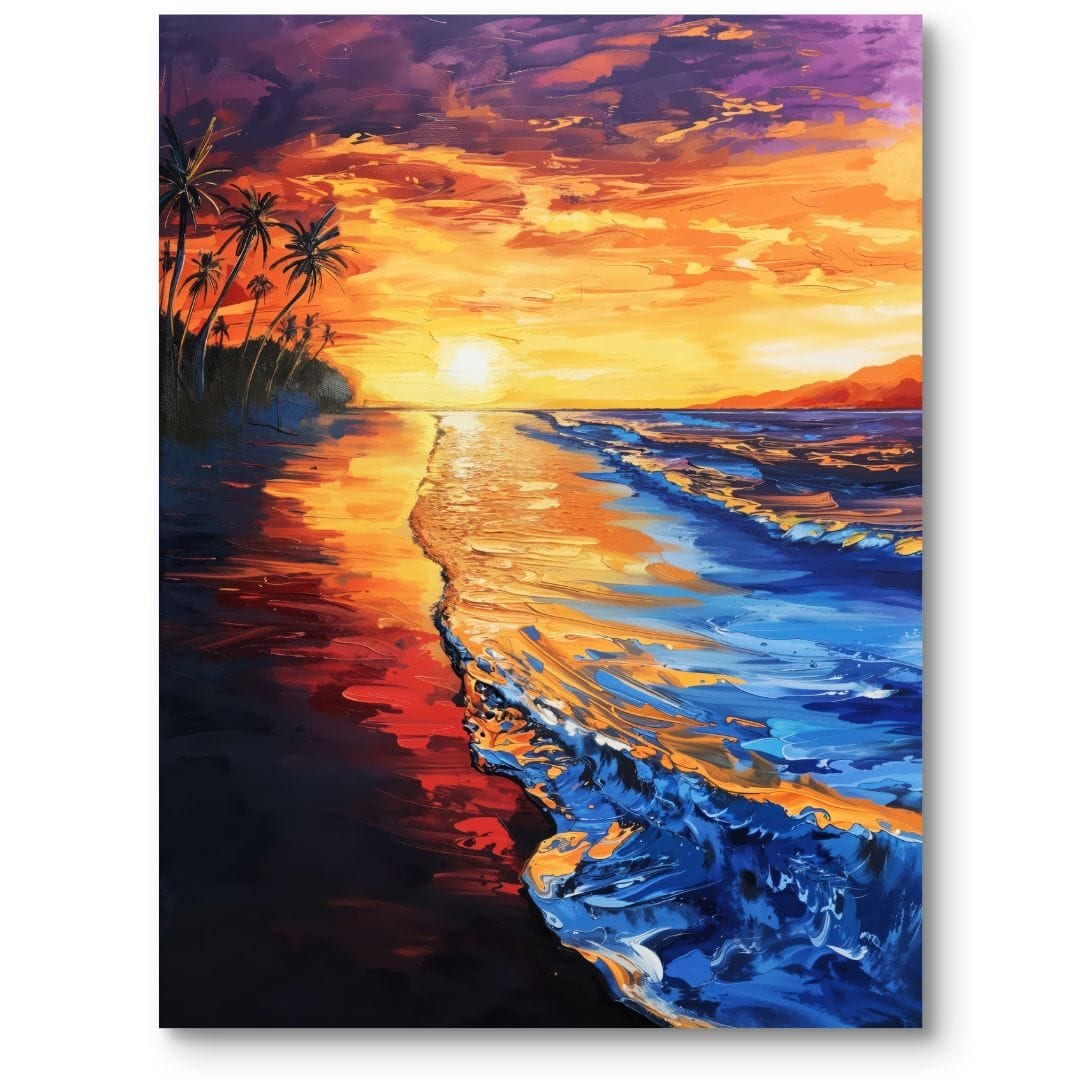Dynamiczne linie fal płynnie kontrastują z delikatnym rytmem palm, tworząc zrównoważoną, harmonijną całość. Ciepłe odcienie pomarańczu i fioletu zachodzącego słońca przenikają się z chłodem niebieskiego morza, budując niepowtarzalną atmosferę obrazu.